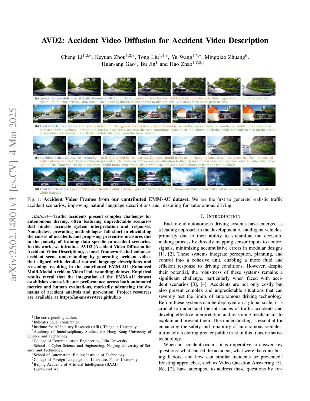 Traffic accidents present complex challenges for autonomous driving, often featuring unpredictable scenarios that hinder accurate system interpretation and responses. Nonetheless, prevailing methodologies fall short in elucidating the causes of accidents and proposing preventive measures due to the paucity of training data specific to accident scenarios. In this work, we introduce AVD2 (Accident Video Diffusion for Accident Video Description), a novel framework that enhances accident scene understanding by generating accident videos that aligned with detailed natural language descriptions and reasoning, resulting in the contributed EMM-AU (Enhanced Multi-Modal Accident Video Understanding) dataset. Empirical results reveal that the integration of the EMM-AU dataset establishes state-of-the-art performance across both automated metrics and human evaluations, markedly advancing the domains of accident analysis and prevention. Project resources are available atthis https URL