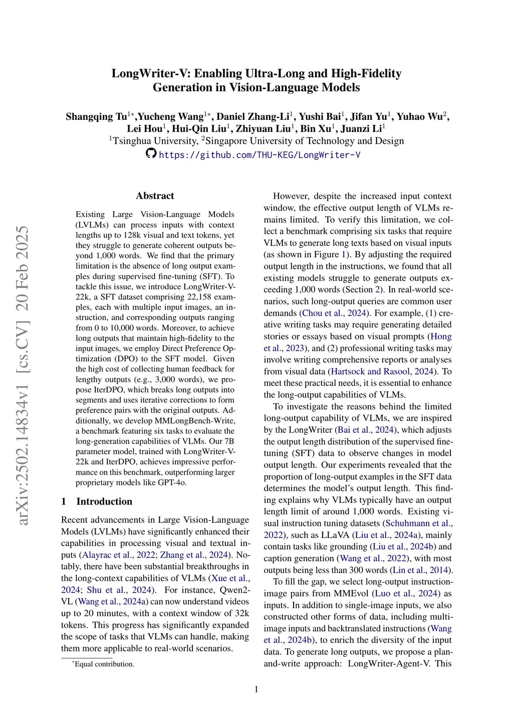 Existing Large Vision-Language Models (LVLMs) can process inputs with context lengths up to 128k visual and text tokens, yet they struggle to generate coherent outputs beyond 1,000 words. We find that the primary limitation is the absence of long output examples during supervised fine-tuning (SFT). To tackle this issue, we introduce LongWriter-V-22k, a SFT dataset comprising 22,158 examples, each with multiple input images, an instruction, and corresponding outputs ranging from 0 to 10,000 words. Moreover, to achieve long outputs that maintain high-fidelity to the input images, we employ Direct Preference Optimization (DPO) to the SFT model. Given the high cost of collecting human feedback for lengthy outputs (e.g., 3,000 words), we propose IterDPO, which breaks long outputs into segments and uses iterative corrections to form preference pairs with the original outputs. Additionally, we develop MMLongBench-Write, a benchmark featuring six tasks to evaluate the long-generation capabilities of VLMs. Our 7B parameter model, trained with LongWriter-V-22k and IterDPO, achieves impressive performance on this benchmark, outperforming larger proprietary models like GPT-4o. Code and data:this https URL