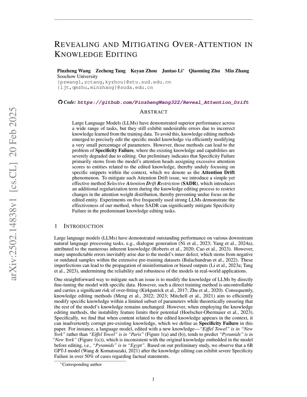 Large Language Models have demonstrated superior performance across a wide range of tasks, but they still exhibit undesirable errors due to incorrect knowledge learned from the training data. To avoid this, knowledge editing methods emerged to precisely edit the specific model knowledge via efficiently modifying a very small percentage of parameters. % However, those methods can lead to the problem of Specificity Failure: when the content related to the edited knowledge occurs in the context, it can inadvertently corrupt other pre-existing knowledge. However, those methods can lead to the problem of Specificity Failure, where the existing knowledge and capabilities are severely degraded due to editing. Our preliminary indicates that Specificity Failure primarily stems from the model's attention heads assigning excessive attention scores to entities related to the edited knowledge, thereby unduly focusing on specific snippets within the context, which we denote as the Attention Drift phenomenon. To mitigate such Attention Drift issue, we introduce a simple yet effective method Selective Attention Drift Restriction}(SADR), which introduces an additional regularization term during the knowledge editing process to restrict changes in the attention weight distribution, thereby preventing undue focus on the edited entity. Experiments on five frequently used strong LLMs demonstrate the effectiveness of our method, where SADR can significantly mitigate Specificity Failure in the predominant knowledge editing tasks.