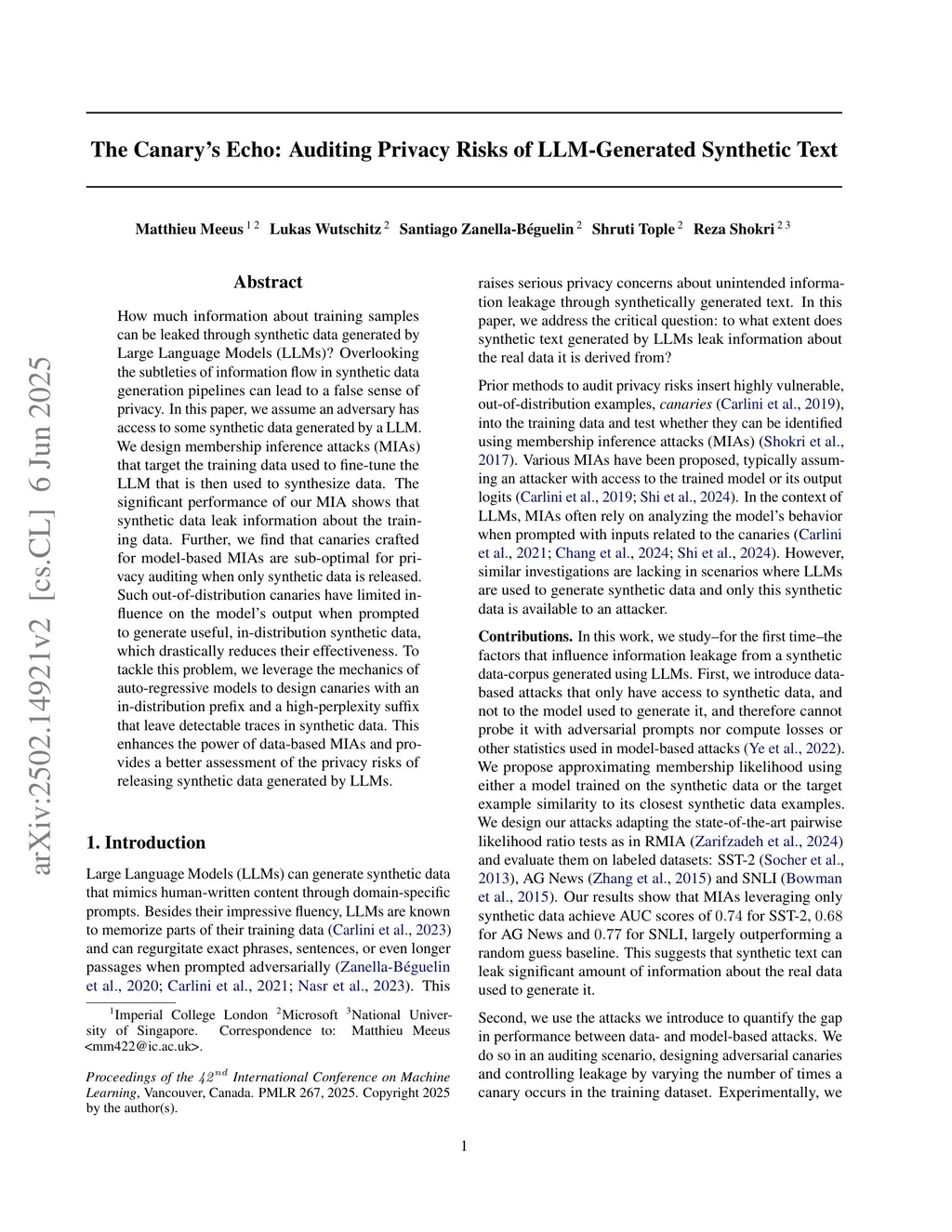 How much information about training samples can be leaked through synthetic data generated by Large Language Models (LLMs)? Overlooking the subtleties of information flow in synthetic data generation pipelines can lead to a false sense of privacy. In this paper, we assume an adversary has access to some synthetic data generated by a LLM. We design membership inference attacks (MIAs) that target the training data used to fine-tune the LLM that is then used to synthesize data. The significant performance of our MIA shows that synthetic data leak information about the training data. Further, we find that canaries crafted for model-based MIAs are sub-optimal for privacy auditing when only synthetic data is released. Such out-of-distribution canaries have limited influence on the model's output when prompted to generate useful, in-distribution synthetic data, which drastically reduces their effectiveness. To tackle this problem, we leverage the mechanics of auto-regressive models to design canaries with an in-distribution prefix and a high-perplexity suffix that leave detectable traces in synthetic data. This enhances the power of data-based MIAs and provides a better assessment of the privacy risks of releasing synthetic data generated by LLMs.