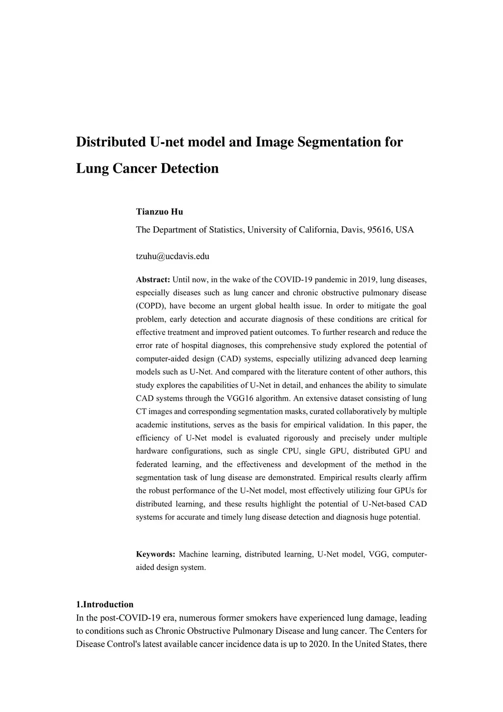 Until now, in the wake of the COVID-19 pandemic in 2019, lung diseases, especially diseases such as lung cancer and chronic obstructive pulmonary disease (COPD), have become an urgent global health issue. In order to mitigate the goal problem, early detection and accurate diagnosis of these conditions are critical for effective treatment and improved patient outcomes. To further research and reduce the error rate of hospital diagnoses, this comprehensive study explored the potential of computer-aided design (CAD) systems, especially utilizing advanced deep learning models such as U-Net. And compared with the literature content of other authors, this study explores the capabilities of U-Net in detail, and enhances the ability to simulate CAD systems through the VGG16 algorithm. An extensive dataset consisting of lung CT images and corresponding segmentation masks, curated collaboratively by multiple academic institutions, serves as the basis for empirical validation. In this paper, the efficiency of U-Net model is evaluated rigorously and precisely under multiple hardware configurations, such as single CPU, single GPU, distributed GPU and federated learning, and the effectiveness and development of the method in the segmentation task of lung disease are demonstrated. Empirical results clearly affirm the robust performance of the U-Net model, most effectively utilizing four GPUs for distributed learning, and these results highlight the potential of U-Net-based CAD systems for accurate and timely lung disease detection and diagnosis huge potential.
