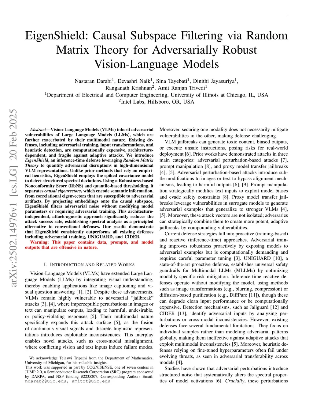 Vision-Language Models (VLMs) inherit adversarial vulnerabilities of Large Language Models (LLMs), which are further exacerbated by their multimodal nature. Existing defenses, including adversarial training, input transformations, and heuristic detection, are computationally expensive, architecture-dependent, and fragile against adaptive attacks. We introduce EigenShield, an inference-time defense leveraging Random Matrix Theory to quantify adversarial disruptions in high-dimensional VLM representations. Unlike prior methods that rely on empirical heuristics, EigenShield employs the spiked covariance model to detect structured spectral deviations. Using a Robustness-based Nonconformity Score (RbNS) and quantile-based thresholding, it separates causal eigenvectors, which encode semantic information, from correlational eigenvectors that are susceptible to adversarial artifacts. By projecting embeddings onto the causal subspace, EigenShield filters adversarial noise without modifying model parameters or requiring adversarial training. This architecture-independent, attack-agnostic approach significantly reduces the attack success rate, establishing spectral analysis as a principled alternative to conventional defenses. Our results demonstrate that EigenShield consistently outperforms all existing defenses, including adversarial training, UNIGUARD, and CIDER.