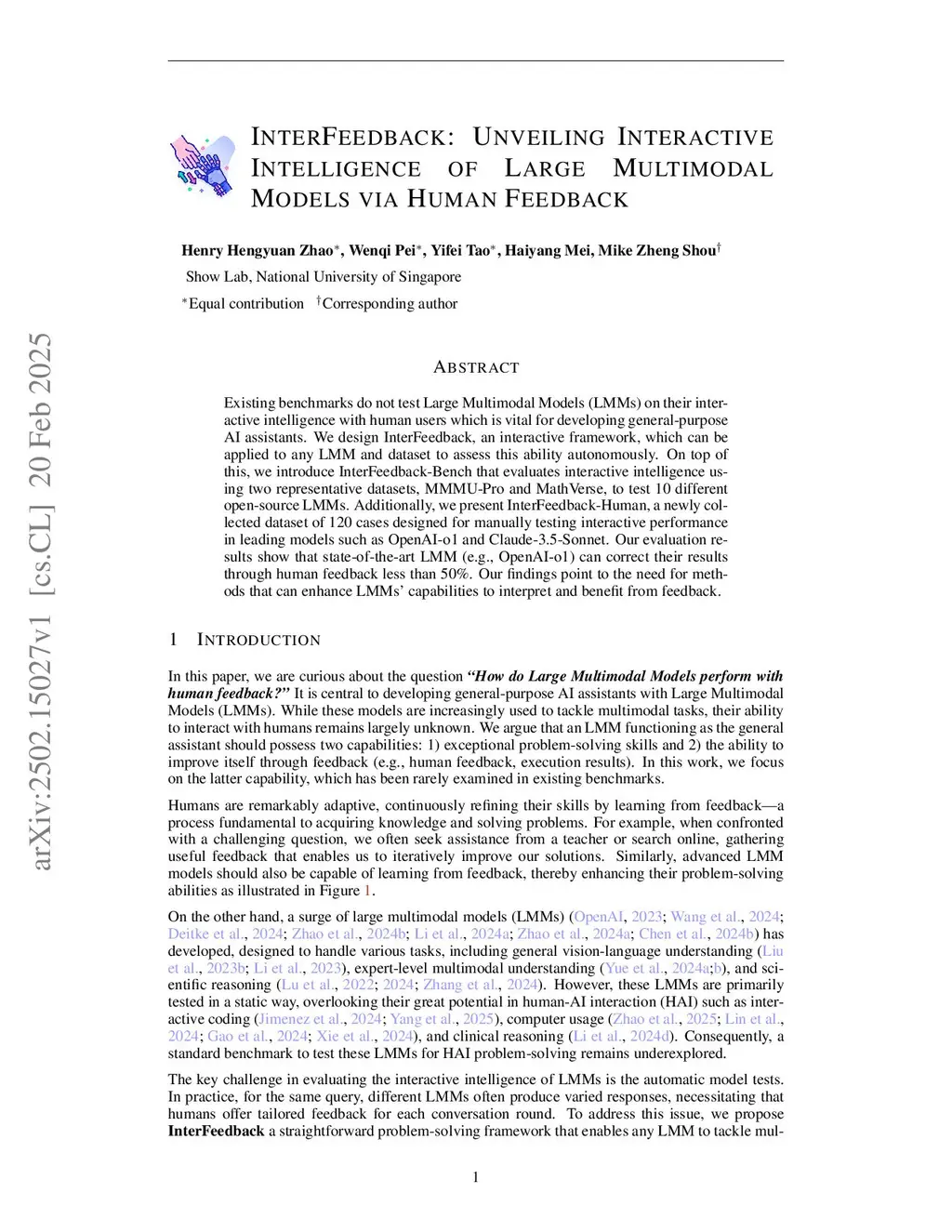 Existing benchmarks do not test Large Multimodal Models (LMMs) on their interactive intelligence with human users, which is vital for developing general-purpose AI assistants. We design InterFeedback, an interactive framework, which can be applied to any LMM and dataset to assess this ability autonomously. On top of this, we introduce InterFeedback-Bench which evaluates interactive intelligence using two representative datasets, MMMU-Pro and MathVerse, to test 10 different open-source LMMs. Additionally, we present InterFeedback-Human, a newly collected dataset of 120 cases designed for manually testing interactive performance in leading models such as OpenAI-o1 and Claude-Sonnet-4. Our evaluation results indicate that even the state-of-the-art LMM, OpenAI-o1, struggles to refine its responses based on human feedback, achieving an average score of less than 50%. Our findings point to the need for methods that can enhance LMMs' capabilities to interpret and benefit from feedback.