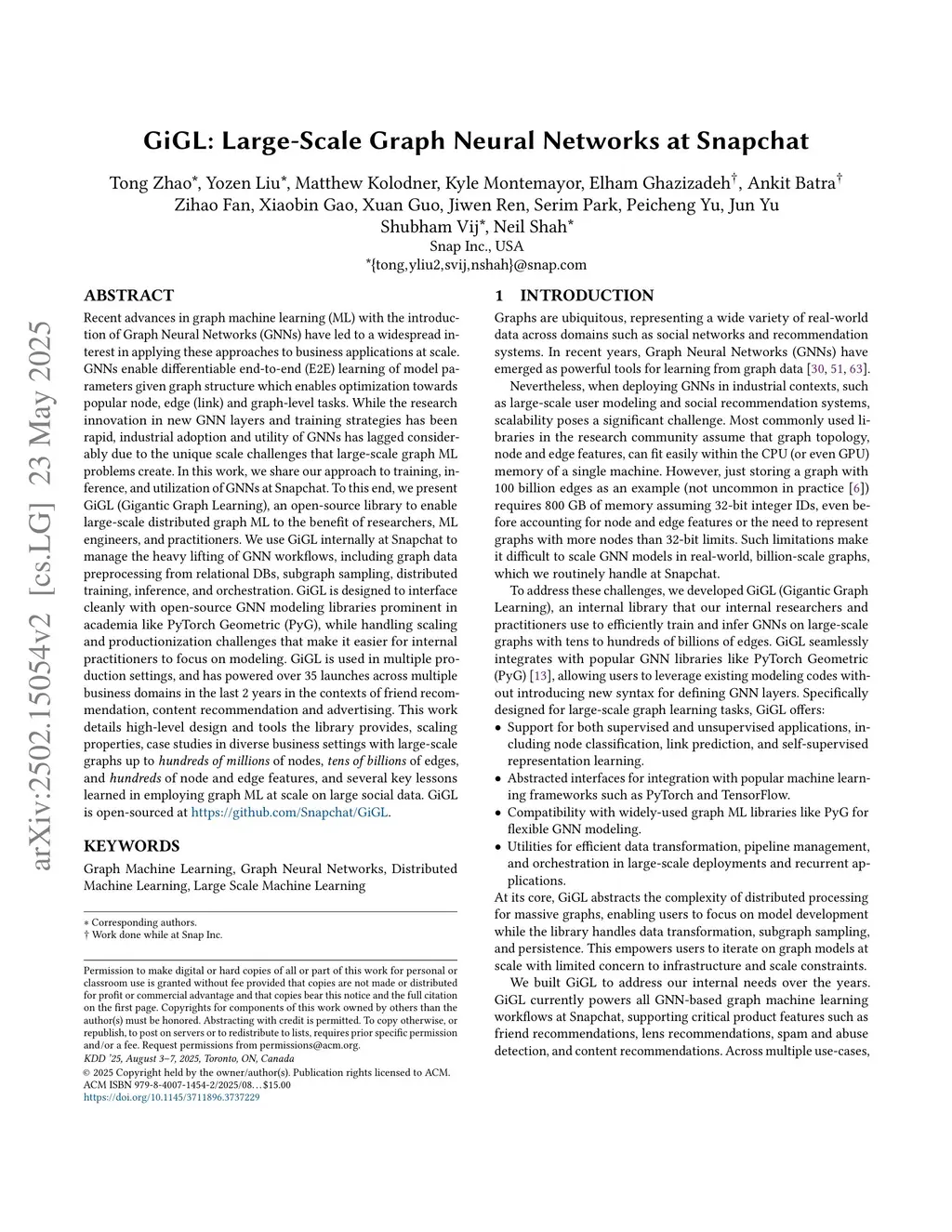 Recent advances in graph machine learning (ML) with the introduction of Graph Neural Networks (GNNs) have led to a widespread interest in applying these approaches to business applications at scale. GNNs enable differentiable end-to-end (E2E) learning of model parameters given graph structure which enables optimization towards popular node, edge (link) and graph-level tasks. While the research innovation in new GNN layers and training strategies has been rapid, industrial adoption and utility of GNNs has lagged considerably due to the unique scale challenges that large-scale graph ML problems create. In this work, we share our approach to training, inference, and utilization of GNNs at Snapchat. To this end, we present GiGL (Gigantic Graph Learning), an open-source library to enable large-scale distributed graph ML to the benefit of researchers, ML engineers, and practitioners. We use GiGL internally at Snapchat to manage the heavy lifting of GNN workflows, including graph data preprocessing from relational DBs, subgraph sampling, distributed training, inference, and orchestration. GiGL is designed to interface cleanly with open-source GNN modeling libraries prominent in academia like PyTorch Geometric (PyG), while handling scaling and productionization challenges that make it easier for internal practitioners to focus on modeling. GiGL is used in multiple production settings, and has powered over 35 launches across multiple business domains in the last 2 years in the contexts of friend recommendation, content recommendation and advertising. This work details high-level design and tools the library provides, scaling properties, case studies in diverse business settings with industry-scale graphs, and several key lessons learned in employing graph ML at scale on large social data. GiGL is open-sourced atthis https URL.