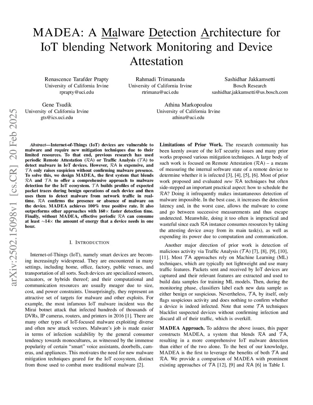 Internet-of-Things (IoT) devices are vulnerable to malware and require new mitigation techniques due to their limited resources. To that end, previous research has used periodic Remote Attestation (RA) or Traffic Analysis (TA) to detect malware in IoT devices. However, RA is expensive, and TA only raises suspicion without confirming malware presence. To solve this, we design MADEA, the first system that blends RA and TA to offer a comprehensive approach to malware detection for the IoT ecosystem. TA builds profiles of expected packet traces during benign operations of each device and then uses them to detect malware from network traffic in real-time. RA confirms the presence or absence of malware on the device. MADEA achieves 100% true positive rate. It also outperforms other approaches with 160x faster detection time. Finally, without MADEA, effective periodic RA can consume at least ~14x the amount of energy that a device needs in one hour.