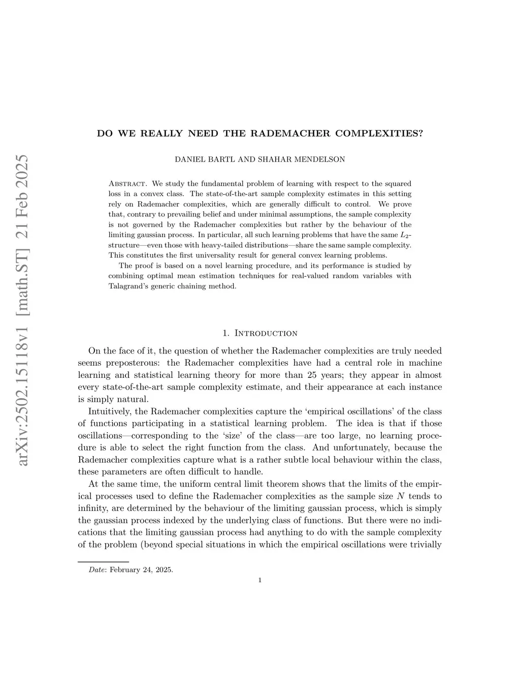 We study the fundamental problem of learning with respect to the squared loss in a convex class. The state-of-the-art sample complexity estimates in this setting rely on Rademacher complexities, which are generally difficult to control. We prove that, contrary to prevailing belief and under minimal assumptions, the sample complexity is not governed by the Rademacher complexities but rather by the behaviour of the limiting gaussian process. In particular, all such learning problems that have the same -structure -- even those with heavy-tailed distributions -- share the same sample complexity. This constitutes the first universality result for general convex learning problems.The proof is based on a novel learning procedure, and its performance is studied by combining optimal mean estimation techniques for real-valued random variables with Talagrand's generic chaining method.