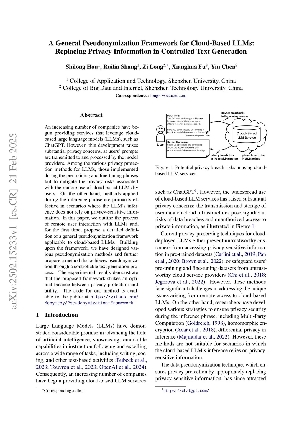 An increasing number of companies have begun providing services that leverage cloud-based large language models (LLMs), such as ChatGPT. However, this development raises substantial privacy concerns, as users' prompts are transmitted to and processed by the model providers. Among the various privacy protection methods for LLMs, those implemented during the pre-training and fine-tuning phrases fail to mitigate the privacy risks associated with the remote use of cloud-based LLMs by users. On the other hand, methods applied during the inference phrase are primarily effective in scenarios where the LLM's inference does not rely on privacy-sensitive information. In this paper, we outline the process of remote user interaction with LLMs and, for the first time, propose a detailed definition of a general pseudonymization framework applicable to cloud-based LLMs. The experimental results demonstrate that the proposed framework strikes an optimal balance between privacy protection and utility. The code for our method is available to the public atthis https URL.