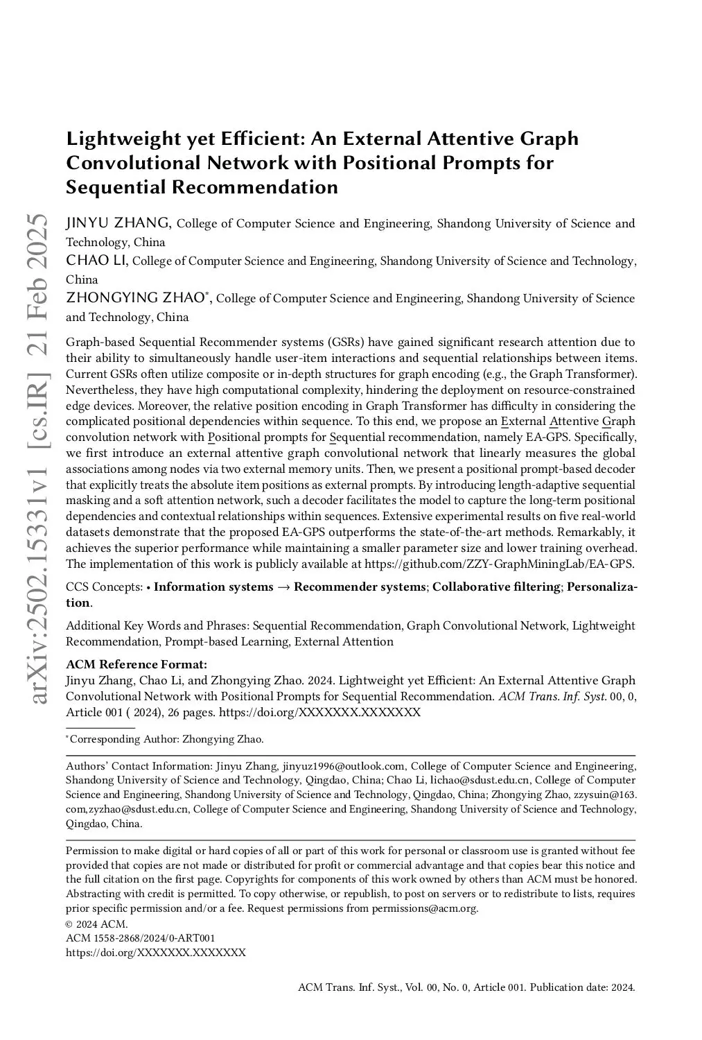 Lightweight yet Efficient: An External Attentive Graph Convolutional Network with Positional Prompts for Sequential Recommendation