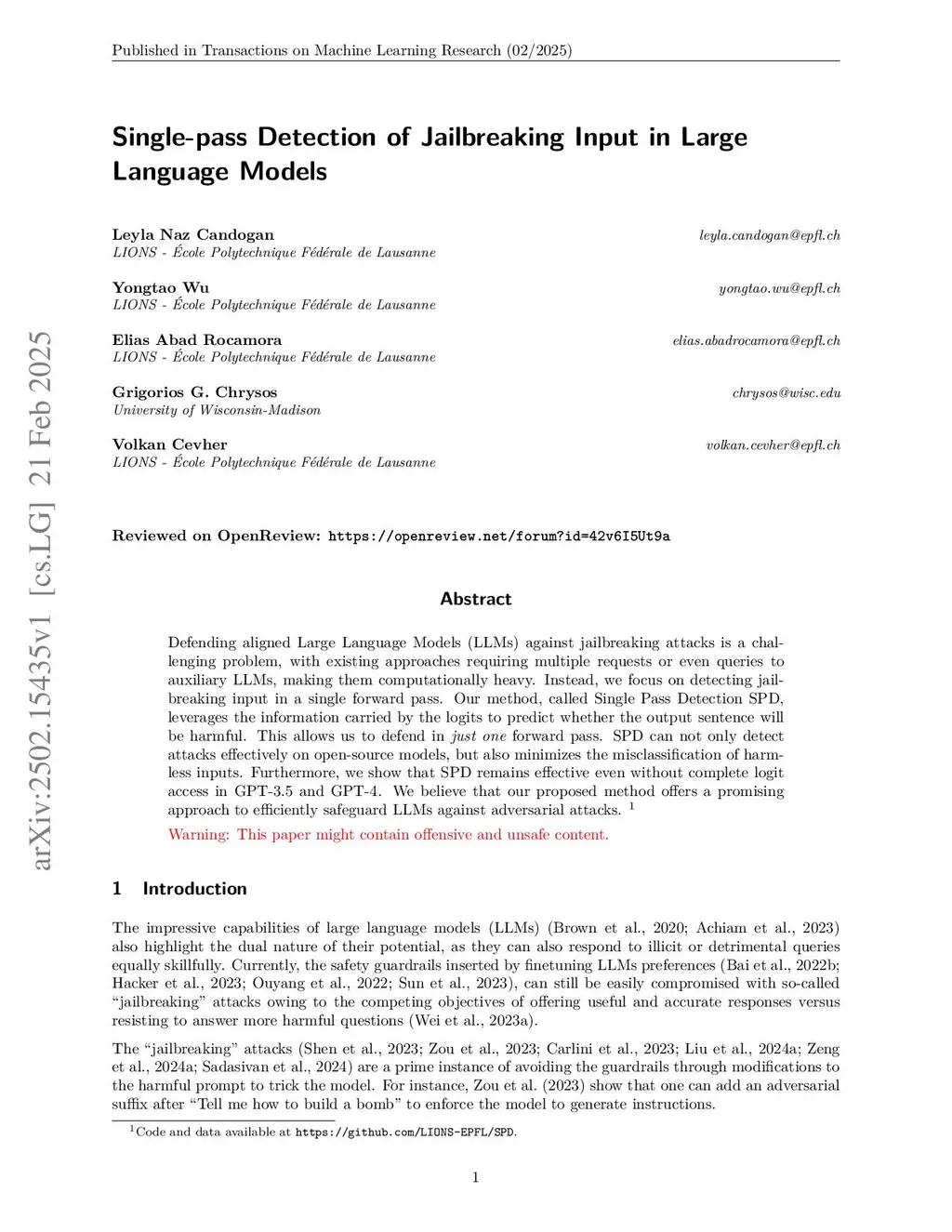 Defending aligned Large Language Models (LLMs) against jailbreaking attacks is a challenging problem, with existing approaches requiring multiple requests or even queries to auxiliary LLMs, making them computationally heavy. Instead, we focus on detecting jailbreaking input in a single forward pass. Our method, called Single Pass Detection SPD, leverages the information carried by the logits to predict whether the output sentence will be harmful. This allows us to defend in just one forward pass. SPD can not only detect attacks effectively on open-source models, but also minimizes the misclassification of harmless inputs. Furthermore, we show that SPD remains effective even without complete logit access in GPT-3.5 and GPT-4. We believe that our proposed method offers a promising approach to efficiently safeguard LLMs against adversarial attacks.