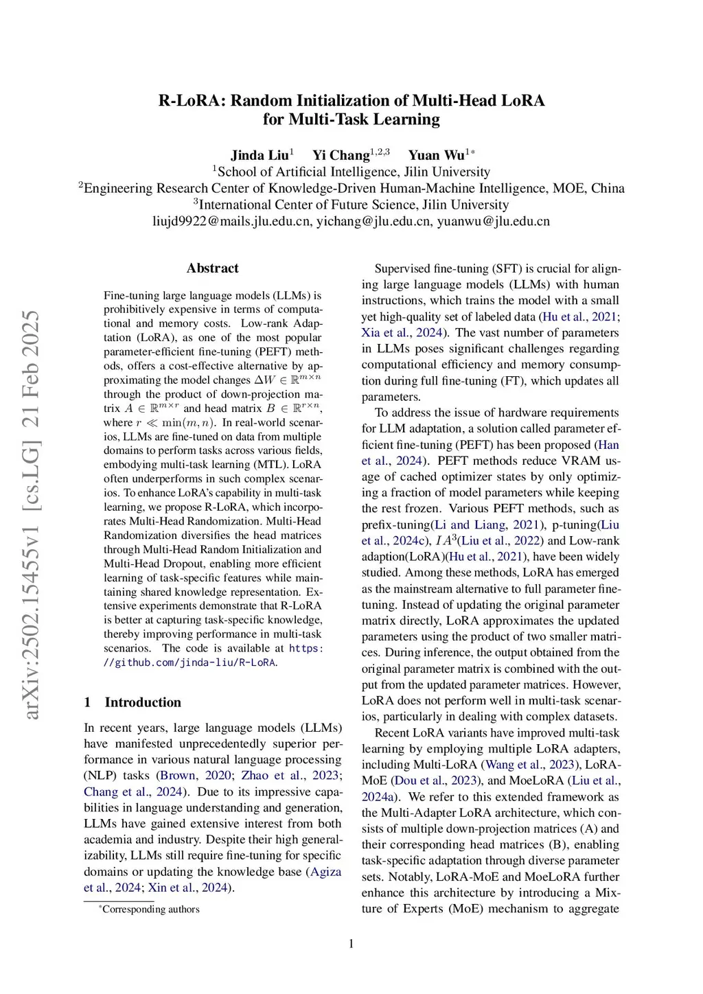 Fine-tuning large language models (LLMs) is computationally expensive, and Low-Rank Adaptation (LoRA) provides a cost-effective solution by approximating weight updates through low-rank matrices. In real-world scenarios, LLMs are fine-tuned on data from multiple domains to perform tasks across various fields, embodying multi-task learning (MTL). LoRA often underperforms in such complex scenarios. To enhance LoRA's capability in multi-task learning, we propose R-LoRA, which incorporates Multi-Head Randomization. Multi-Head Randomization diversifies the head matrices through Multi-Head Dropout and Multi-Head Random Initialization, enabling more efficient learning of task-specific features while maintaining shared knowledge representation. Our approach not only improves performance in MTL but also reduces GPU memory usage and training time. Experiments show that R-LoRA's gains stem from increased diversity in the head matrices, demonstrating its effectiveness for multi-task learning. The code is available atthis https URL