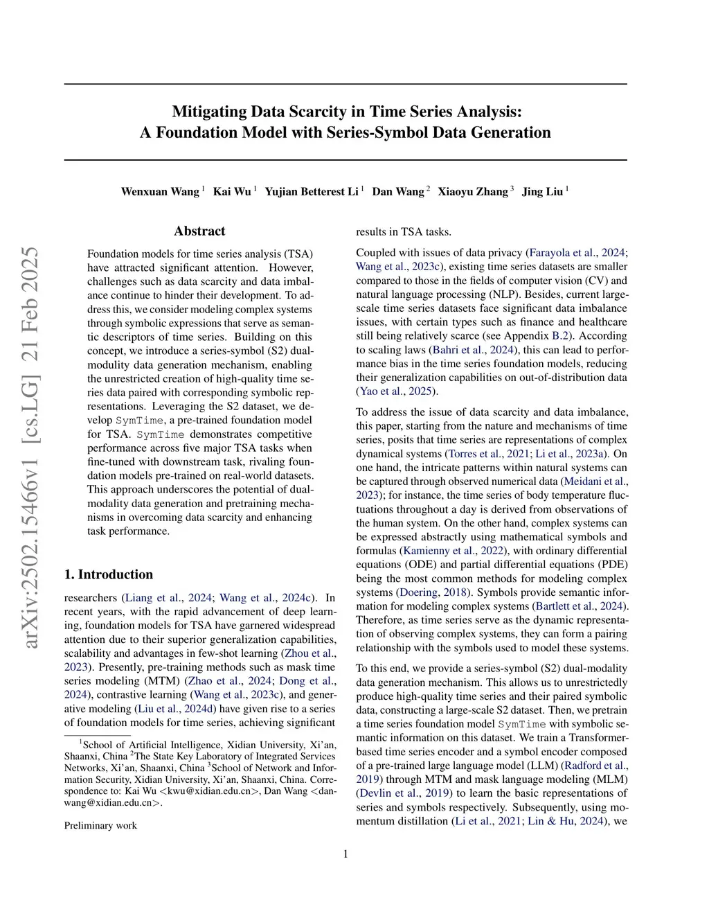 Foundation models for time series analysis (TSA) have attracted significant attention. However, challenges such as data scarcity and data imbalance continue to hinder their development. To address this, we consider modeling complex systems through symbolic expressions that serve as semantic descriptors of time series. Building on this concept, we introduce a series-symbol (S2) dual-modulity data generation mechanism, enabling the unrestricted creation of high-quality time series data paired with corresponding symbolic representations. Leveraging the S2 dataset, we develop SymTime, a pre-trained foundation model for TSA. SymTime demonstrates competitive performance across five major TSA tasks when fine-tuned with downstream task, rivaling foundation models pre-trained on real-world datasets. This approach underscores the potential of dual-modality data generation and pretraining mechanisms in overcoming data scarcity and enhancing task performance.