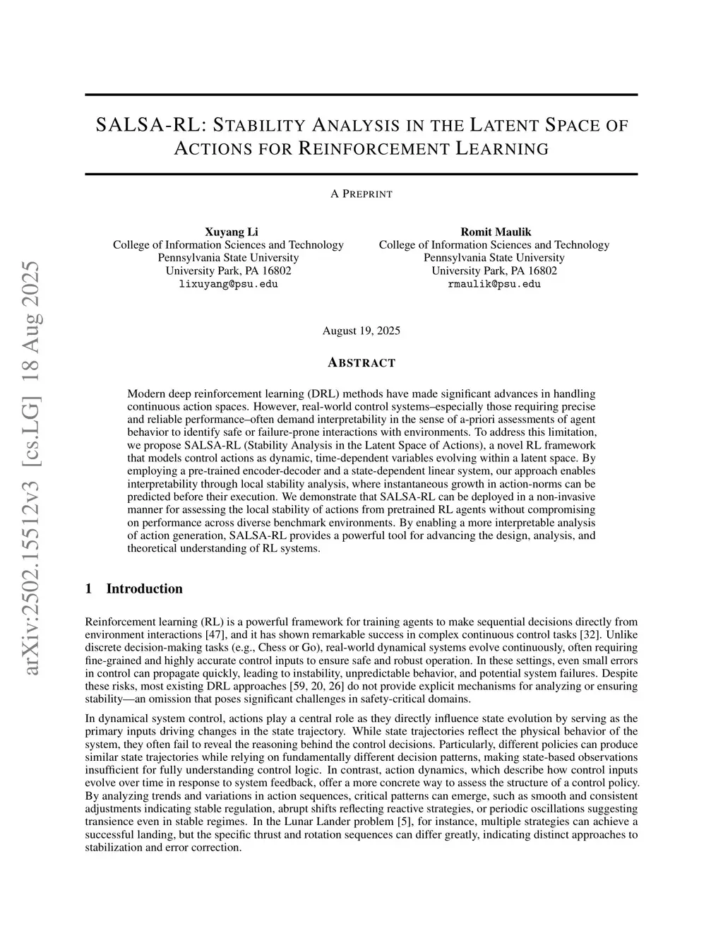 SALSA-RL: Stability Analysis in the Latent Space of Actions for Reinforcement Learning