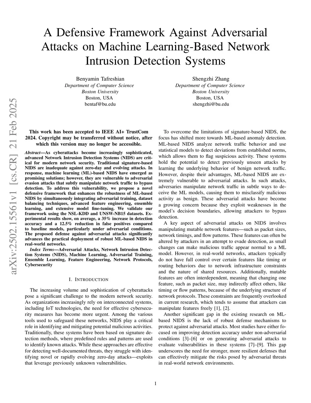 A Defensive Framework Against Adversarial Attacks on Machine Learning-Based Network Intrusion Detection Systems