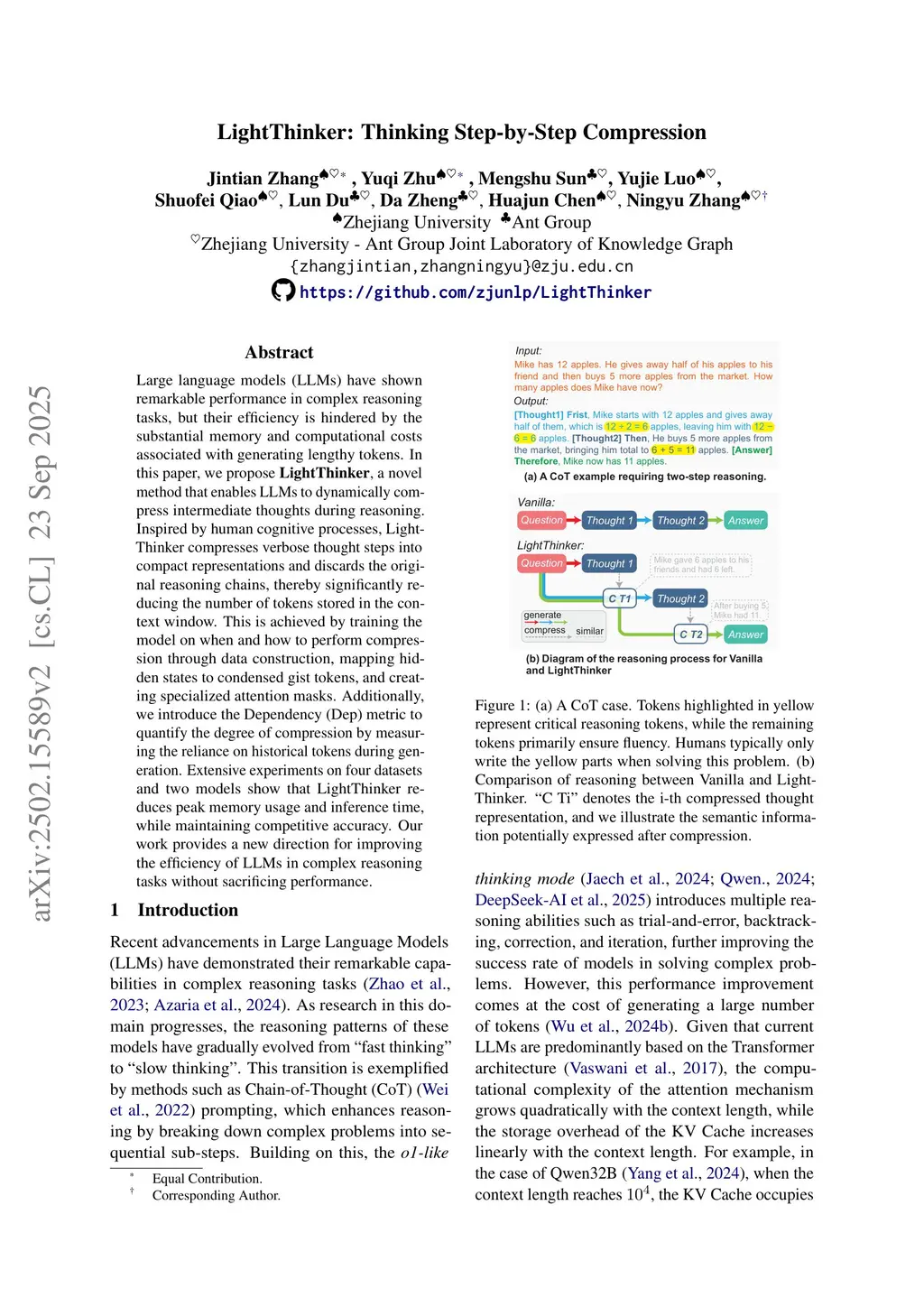 Large language models (LLMs) have shown remarkable performance in complex reasoning tasks, but their efficiency is hindered by the substantial memory and computational costs associated with generating lengthy tokens. In this paper, we propose LightThinker, a novel method that enables LLMs to dynamically compress intermediate thoughts during reasoning. Inspired by human cognitive processes, LightThinker compresses verbose thought steps into compact representations and discards the original reasoning chains, thereby significantly reducing the number of tokens stored in the context window. This is achieved by training the model on when and how to perform compression through data construction, mapping hidden states to condensed gist tokens, and creating specialized attention masks. Additionally, we introduce the Dependency (Dep) metric to quantify the degree of compression by measuring the reliance on historical tokens during generation. Extensive experiments on four datasets and two models show that LightThinker reduces peak memory usage and inference time, while maintaining competitive accuracy. Our work provides a new direction for improving the efficiency of LLMs in complex reasoning tasks without sacrificing performance. Code will be released atthis https URL.
