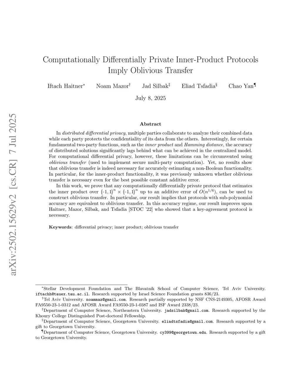 In distributed differential privacy, multiple parties collaborate to analyze their combined data while each party protects the confidentiality of its data from the others. Interestingly, for certain fundamental two-party functions, such as the inner product and Hamming distance, the accuracy of distributed solutions significantly lags behind what can be achieved in the centralized model. For computational differential privacy, however, these limitations can be circumvented using oblivious transfer (used to implement secure multi-party computation). Yet, no results show that oblivious transfer is indeed necessary for accurately estimating a non-Boolean functionality. In particular, for the inner-product functionality, it was previously unknown whether oblivious transfer is necessary even for the best possible constant additive error.In this work, we prove that any computationally differentially private protocol that estimates the inner product over up to an additive error of , can be used to construct oblivious transfer. In particular, our result implies that protocols with sub-polynomial accuracy are equivalent to oblivious transfer. In this accuracy regime, our result improves upon Haitner, Mazor, Silbak, and Tsfadia [STOC '22], who showed that a key-agreement protocol is necessary.