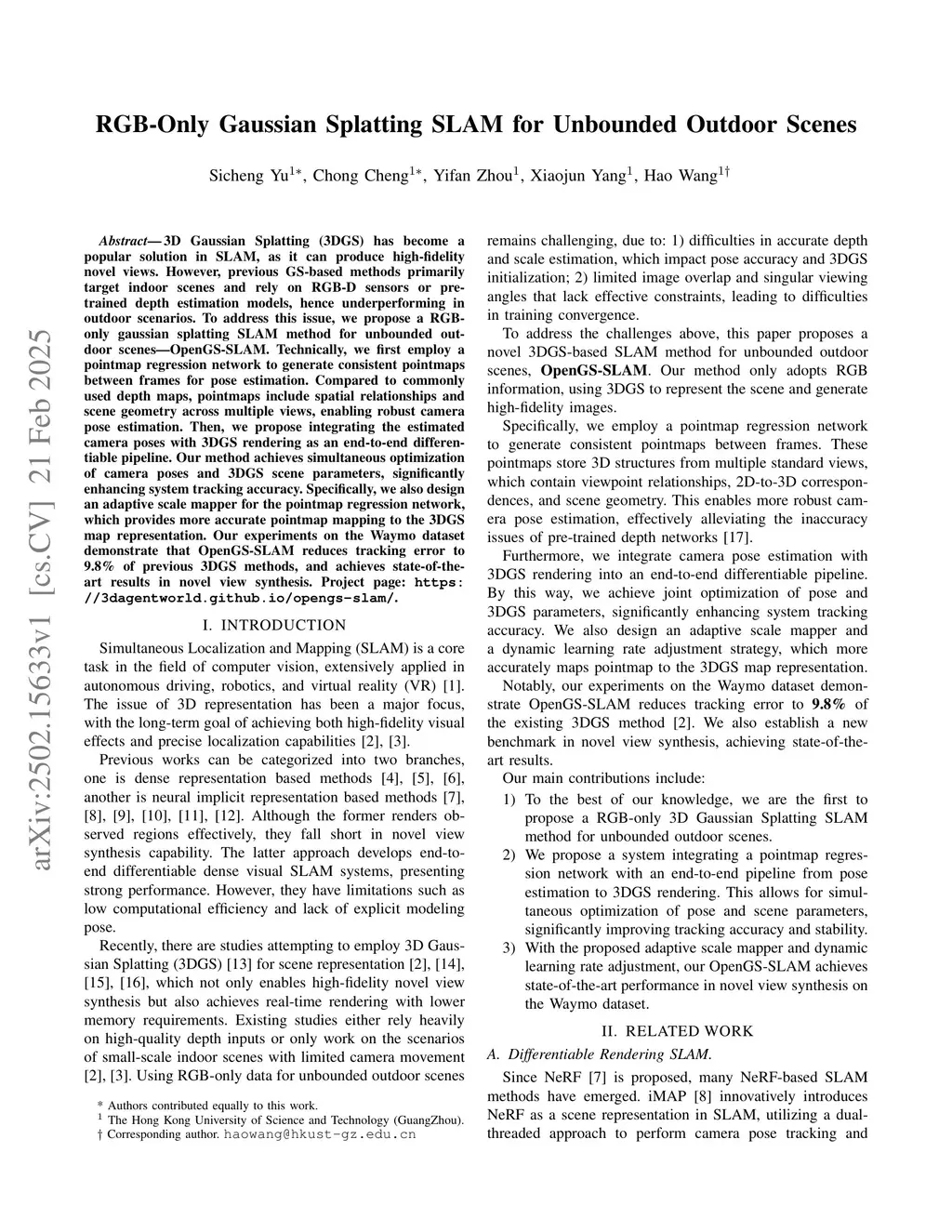 3D Gaussian Splatting (3DGS) has become a popular solution in SLAM, as it can produce high-fidelity novel views. However, previous GS-based methods primarily target indoor scenes and rely on RGB-D sensors or pre-trained depth estimation models, hence underperforming in outdoor scenarios. To address this issue, we propose a RGB-only gaussian splatting SLAM method for unbounded outdoor scenes--OpenGS-SLAM. Technically, we first employ a pointmap regression network to generate consistent pointmaps between frames for pose estimation. Compared to commonly used depth maps, pointmaps include spatial relationships and scene geometry across multiple views, enabling robust camera pose estimation. Then, we propose integrating the estimated camera poses with 3DGS rendering as an end-to-end differentiable pipeline. Our method achieves simultaneous optimization of camera poses and 3DGS scene parameters, significantly enhancing system tracking accuracy. Specifically, we also design an adaptive scale mapper for the pointmap regression network, which provides more accurate pointmap mapping to the 3DGS map representation. Our experiments on the Waymo dataset demonstrate that OpenGS-SLAM reduces tracking error to 9.8\% of previous 3DGS methods, and achieves state-of-the-art results in novel view synthesis. Project Page:this https URL