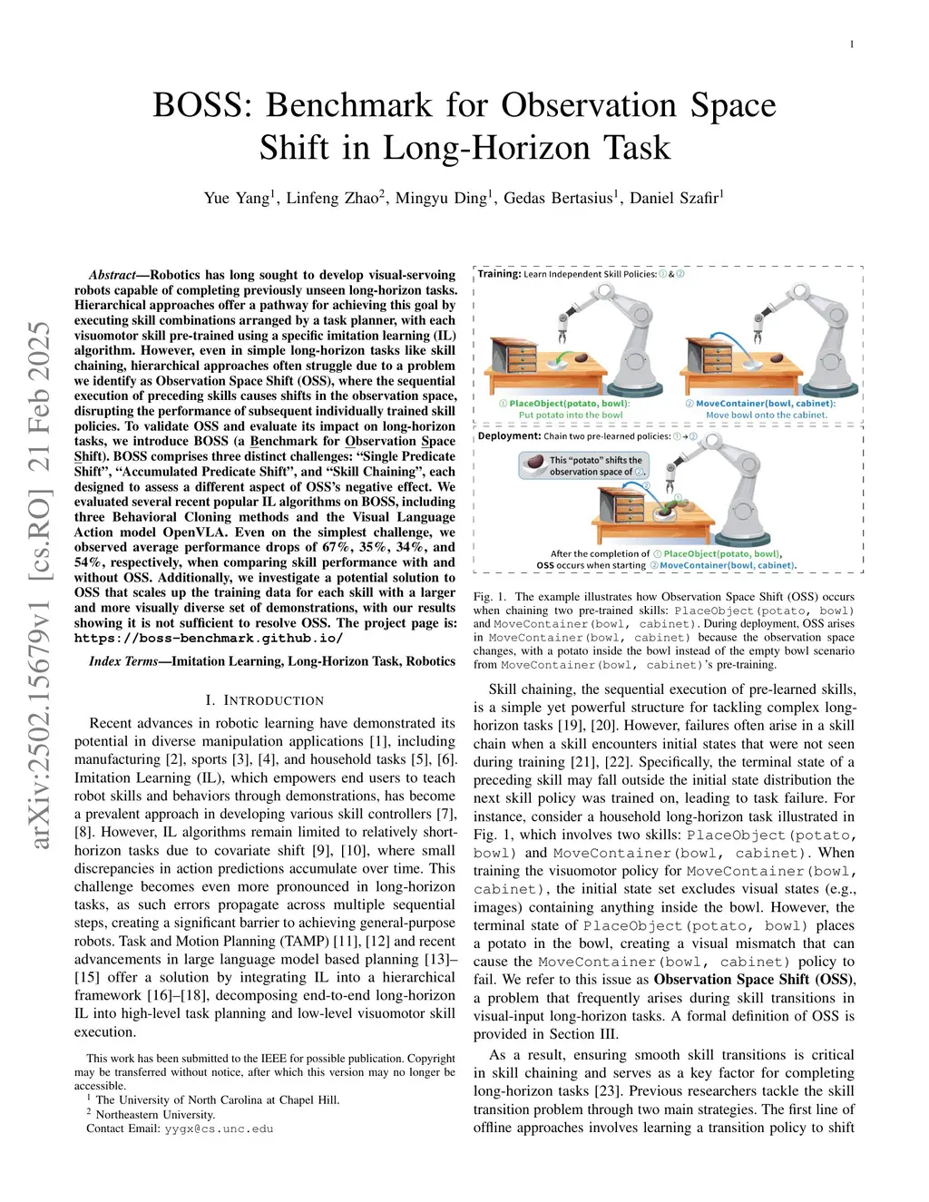 Robotics has long sought to develop visual-servoing robots capable of completing previously unseen long-horizon tasks. Hierarchical approaches offer a pathway for achieving this goal by executing skill combinations arranged by a task planner, with each visuomotor skill pre-trained using a specific imitation learning (IL) algorithm. However, even in simple long-horizon tasks like skill chaining, hierarchical approaches often struggle due to a problem we identify as Observation Space Shift (OSS), where the sequential execution of preceding skills causes shifts in the observation space, disrupting the performance of subsequent individually trained skill policies. To validate OSS and evaluate its impact on long-horizon tasks, we introduce BOSS (a Benchmark for Observation Space Shift). BOSS comprises three distinct challenges: "Single Predicate Shift", "Accumulated Predicate Shift", and "Skill Chaining", each designed to assess a different aspect of OSS's negative effect. We evaluated several recent popular IL algorithms on BOSS, including three Behavioral Cloning methods and the Visual Language Action model OpenVLA. Even on the simplest challenge, we observed average performance drops of 67%, 35%, 34%, and 54%, respectively, when comparing skill performance with and without OSS. Additionally, we investigate a potential solution to OSS that scales up the training data for each skill with a larger and more visually diverse set of demonstrations, with our results showing it is not sufficient to resolve OSS. The project page is:this https URL