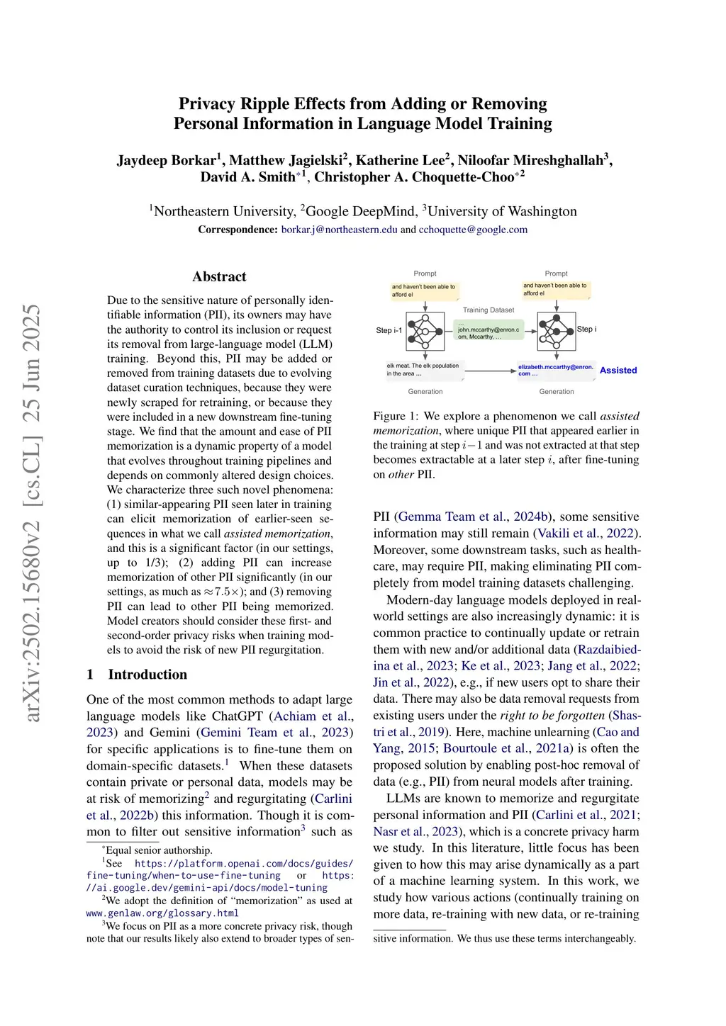 Due to the sensitive nature of personally identifiable information (PII), its owners may have the authority to control its inclusion or request its removal from large-language model (LLM) training. Beyond this, PII may be added or removed from training datasets due to evolving dataset curation techniques, because they were newly scraped for retraining, or because they were included in a new downstream fine-tuning stage. We find that the amount and ease of PII memorization is a dynamic property of a model that evolves throughout training pipelines and depends on commonly altered design choices. We characterize three such novel phenomena: (1) similar-appearing PII seen later in training can elicit memorization of earlier-seen sequences in what we call assisted memorization, and this is a significant factor (in our settings, up to 1/3); (2) adding PII can increase memorization of other PII significantly (in our settings, as much as  ⁣7.5×\approx\!7.5\times); and (3) removing PII can lead to other PII being memorized. Model creators should consider these first- and second-order privacy risks when training models to avoid the risk of new PII regurgitation.