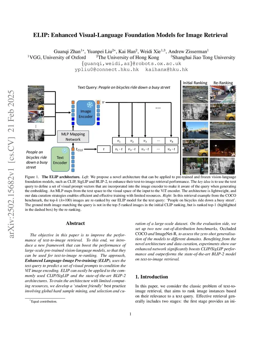 The objective in this paper is to improve the performance of text-to-image retrieval. To this end, we introduce a new framework that can boost the performance of large-scale pre-trained vision-language models, so that they can be used for text-to-image re-ranking. The approach, Enhanced Language-Image Pre-training (ELIP), uses the text query, via a simple MLP mapping network, to predict a set of visual prompts to condition the ViT image encoding. ELIP can easily be applied to the commonly used CLIP, SigLIP and BLIP-2 networks. To train the architecture with limited computing resources, we develop a 'student friendly' best practice, involving global hard sample mining, and curation of a large-scale dataset. On the evaluation side, we set up two new out-of-distribution (OOD) benchmarks, Occluded COCO and ImageNet-R, to assess the zero-shot generalisation of the models to different domains. The results demonstrate that ELIP significantly boosts CLIP/SigLIP/SigLIP-2 text-to-image retrieval performance and outperforms BLIP-2 on several benchmarks, as well as providing an easy means to adapt to OOD datasets.