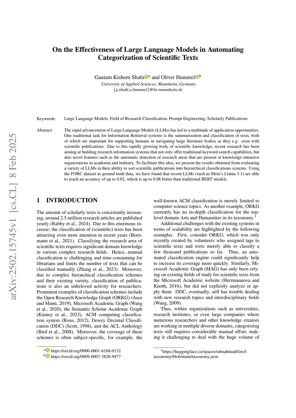 On the Effectiveness of Large Language Models in Automating Categorization of Scientific Texts
