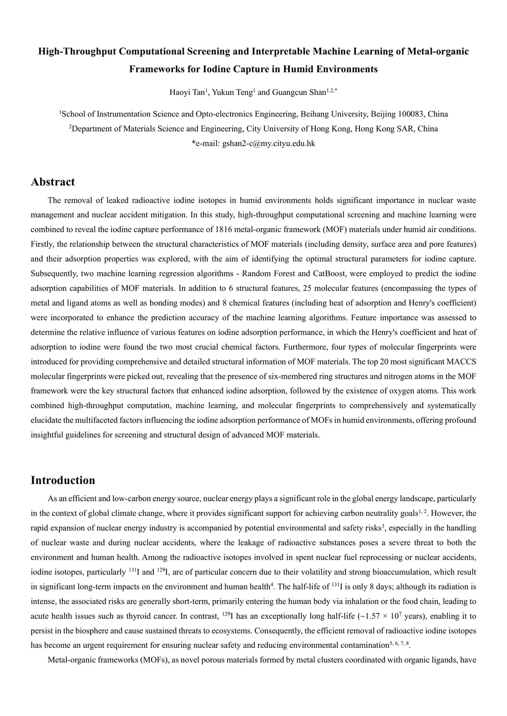 The removal of leaked radioactive iodine isotopes in humid environments holds significant importance in nuclear waste management and nuclear accident mitigation. In this study, high-throughput computational screening and machine learning were combined to reveal the iodine capture performance of 1816 metal-organic framework (MOF) materials under humid air conditions. Firstly, the relationship between the structural characteristics of MOFs and their adsorption properties was explored, with the aim of identifying the optimal structural parameters for iodine capture. Subsequently, two machine learning regression algorithms - Random Forest and CatBoost, were employed to predict the iodine adsorption capabilities of MOFs. In addition to 6 structural features, 25 molecular features and 8 chemical features were incorporated to enhance the prediction accuracy of the machine learning algorithms. Feature importance was assessed to determine the relative influence of various features on iodine adsorption performance, in which the Henry's coefficient and heat of adsorption to iodine were found the two most crucial chemical factors. Furthermore, four types of molecular fingerprints were introduced for providing comprehensive and detailed structural information of MOF materials. The top 20 most significant MACCS molecular fingerprints were picked out, revealing that the presence of six-membered ring structures and nitrogen atoms in the MOFs were the key structural factors that enhanced iodine adsorption, followed by the existence of oxygen atoms. This work combined high-throughput computation, machine learning, and molecular fingerprints to comprehensively elucidate the multifaceted factors influencing the iodine adsorption performance of MOFs, offering profound insightful guidelines for screening and structural design of advanced MOF materials.