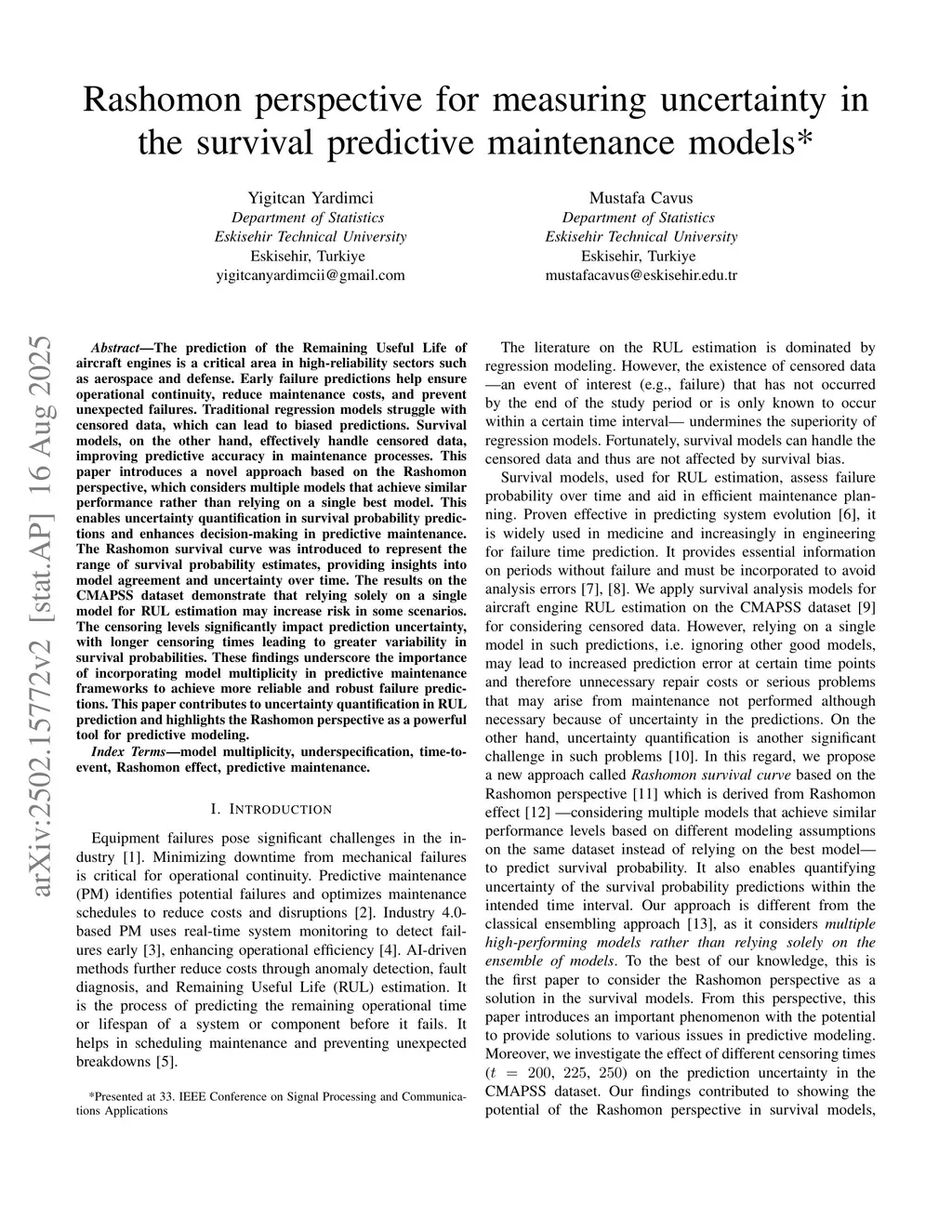 The prediction of the Remaining Useful Life of aircraft engines is a critical area in high-reliability sectors such as aerospace and defense. Early failure predictions help ensure operational continuity, reduce maintenance costs, and prevent unexpected failures. Traditional regression models struggle with censored data, which can lead to biased predictions. Survival models, on the other hand, effectively handle censored data, improving predictive accuracy in maintenance processes. This paper introduces a novel approach based on the Rashomon perspective, which considers multiple models that achieve similar performance rather than relying on a single best model. This enables uncertainty quantification in survival probability predictions and enhances decision-making in predictive maintenance. The Rashomon survival curve was introduced to represent the range of survival probability estimates, providing insights into model agreement and uncertainty over time. The results on the CMAPSS dataset demonstrate that relying solely on a single model for RUL estimation may increase risk in some scenarios. The censoring levels significantly impact prediction uncertainty, with longer censoring times leading to greater variability in survival probabilities. These findings underscore the importance of incorporating model multiplicity in predictive maintenance frameworks to achieve more reliable and robust failure predictions. This paper contributes to uncertainty quantification in RUL prediction and highlights the Rashomon perspective as a powerful tool for predictive modeling.