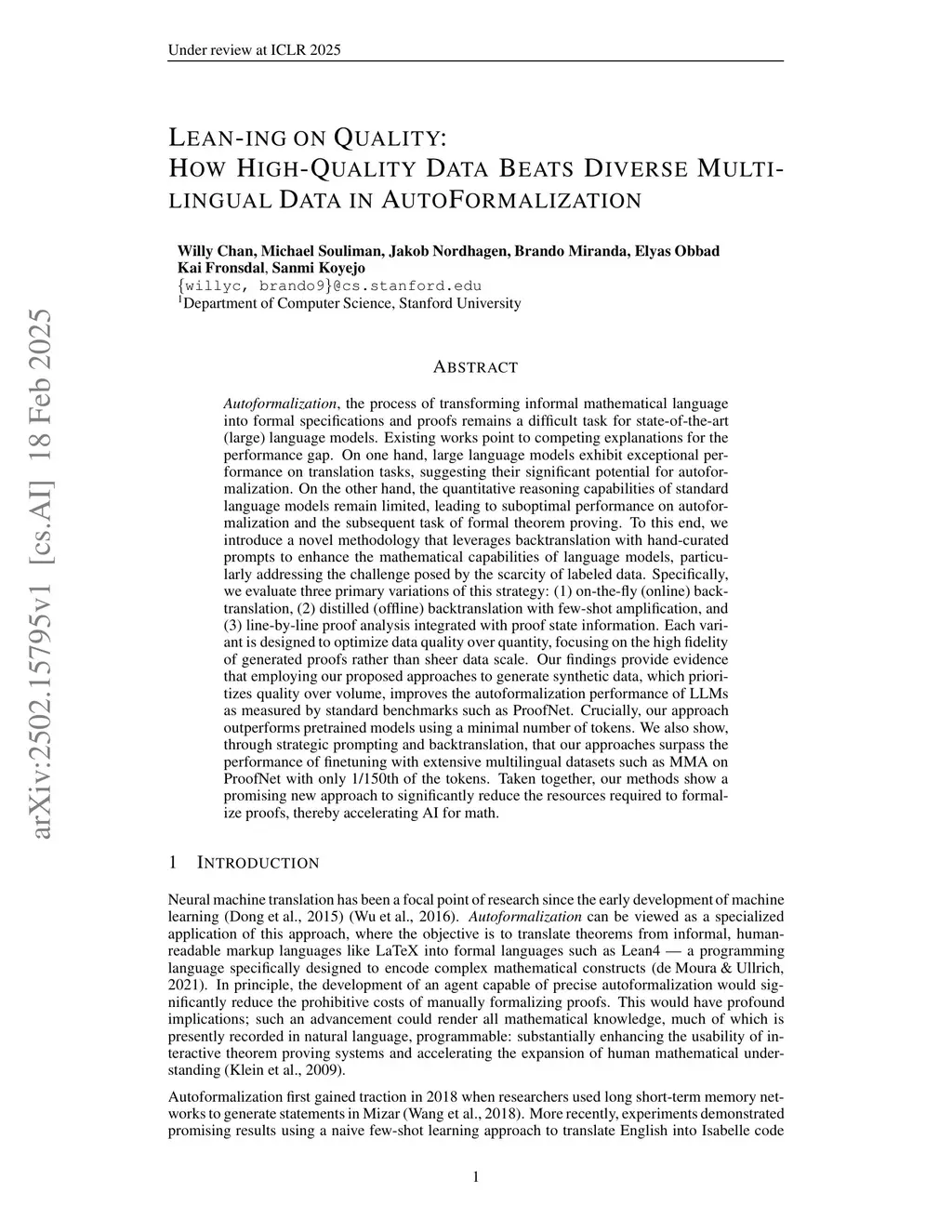 Autoformalization, the process of transforming informal mathematical language into formal specifications and proofs remains a difficult task for state-of-the-art (large) language models. Existing works point to competing explanations for the performance gap. To this end, we introduce a novel methodology that leverages back-translation with hand-curated prompts to enhance the mathematical capabilities of language models, particularly addressing the challenge posed by the scarcity of labeled data. Specifically, we evaluate three primary variations of this strategy: (1) on-the-fly (online) backtranslation, (2) distilled (offline) backtranslation with few-shot amplification, and (3) line-by-line proof analysis integrated with proof state information. Each variant is designed to optimize data quality over quantity, focusing on the high fidelity of generated proofs rather than sheer data scale. Our findings provide evidence that employing our proposed approaches to generate synthetic data, which prioritizes quality over volume, improves the Autoformalization performance of LLMs as measured by standard benchmarks such as ProofNet. Crucially, our approach outperforms pretrained models using a minimal number of tokens. We also show, through strategic prompting and backtranslation, that our approaches surpass the performance of fine-tuning with extensive multilingual datasets such as MMA on ProofNet with only 1/150th of the tokens. Taken together, our methods show a promising new approach to significantly reduce the resources required to formalize proofs, thereby accelerating AI for math.