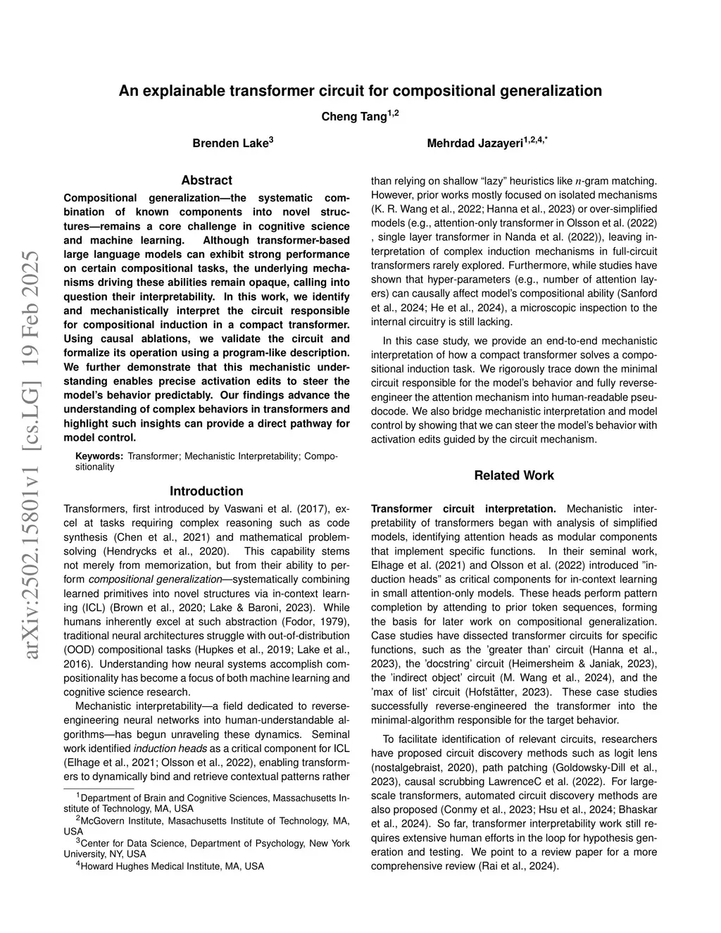 Compositional generalization-the systematic combination of known components into novel structures-remains a core challenge in cognitive science and machine learning. Although transformer-based large language models can exhibit strong performance on certain compositional tasks, the underlying mechanisms driving these abilities remain opaque, calling into question their interpretability. In this work, we identify and mechanistically interpret the circuit responsible for compositional induction in a compact transformer. Using causal ablations, we validate the circuit and formalize its operation using a program-like description. We further demonstrate that this mechanistic understanding enables precise activation edits to steer the model's behavior predictably. Our findings advance the understanding of complex behaviors in transformers and highlight such insights can provide a direct pathway for model control.