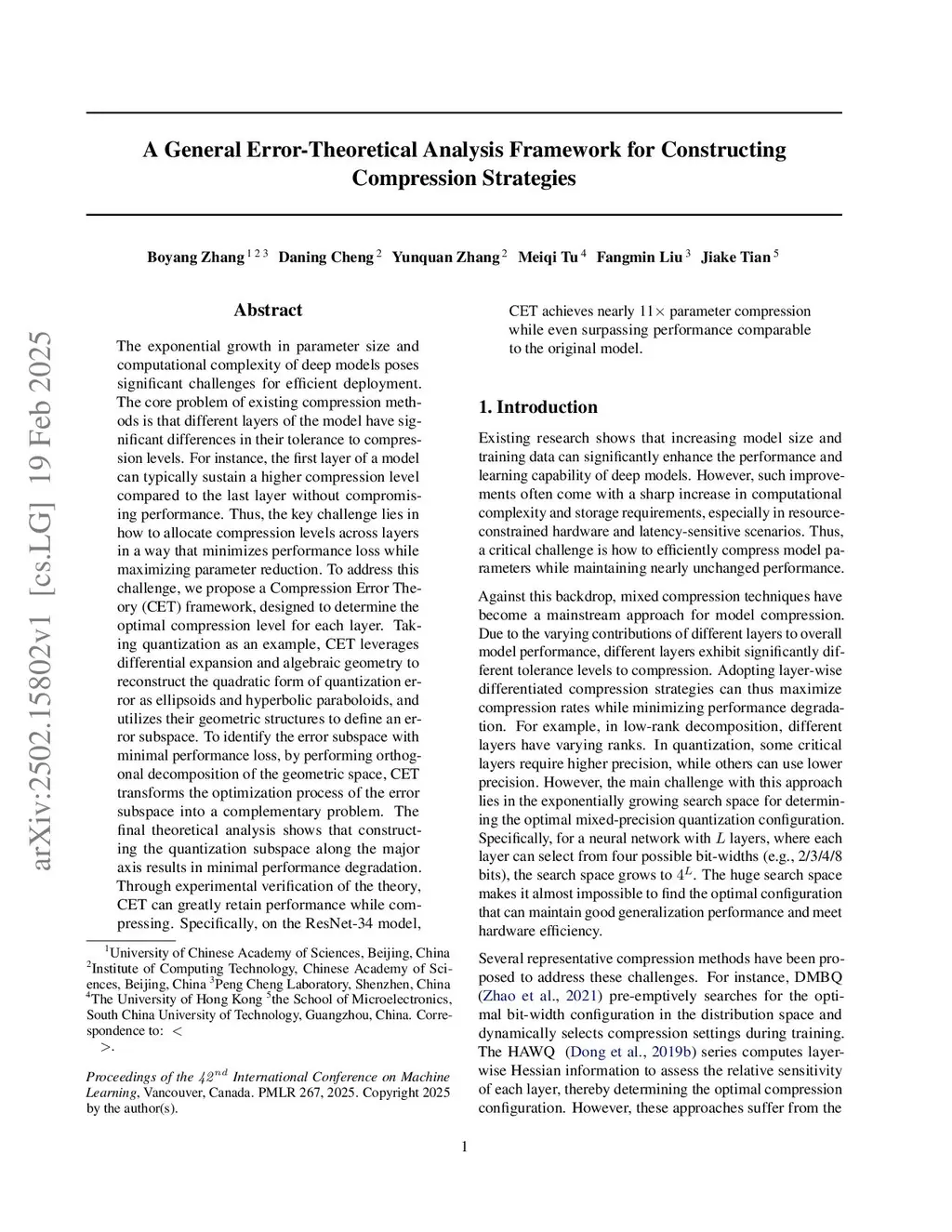 The exponential growth in parameter size and computational complexity of deep models poses significant challenges for efficient deployment. The core problem of existing compression methods is that different layers of the model have significant differences in their tolerance to compression levels. For instance, the first layer of a model can typically sustain a higher compression level compared to the last layer without compromising performance. Thus, the key challenge lies in how to allocate compression levels across layers in a way that minimizes performance loss while maximizing parameter reduction. To address this challenge, we propose a Compression Error Theory (CET) framework, designed to determine the optimal compression level for each layer. Taking quantization as an example, CET leverages differential expansion and algebraic geometry to reconstruct the quadratic form of quantization error as ellipsoids and hyperbolic paraboloids, and utilizes their geometric structures to define an error subspace. To identify the error subspace with minimal performance loss, by performing orthogonal decomposition of the geometric space, CET transforms the optimization process of the error subspace into a complementary problem. The final theoretical analysis shows that constructing the quantization subspace along the major axis results in minimal performance degradation. Through experimental verification of the theory, CET can greatly retain performance while compressing. Specifically, on the ResNet-34 model, CET achieves nearly 11 parameter compression while even surpassing performance comparable to the original model.