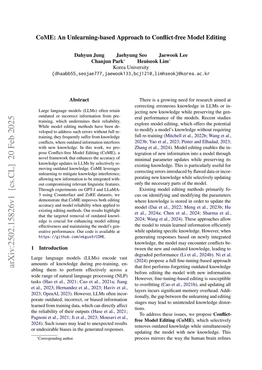 CoME: An Unlearning-based Approach to Conflict-free Model Editing