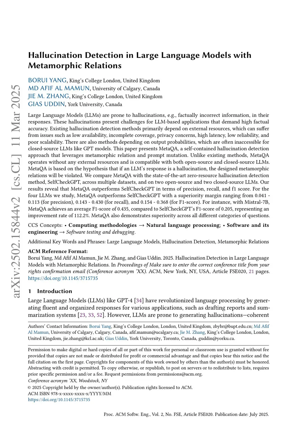 Large Language Models (LLMs) are prone to hallucinations, e.g., factually incorrect information, in their responses. These hallucinations present challenges for LLM-based applications that demand high factual accuracy. Existing hallucination detection methods primarily depend on external resources, which can suffer from issues such as low availability, incomplete coverage, privacy concerns, high latency, low reliability, and poor scalability. There are also methods depending on output probabilities, which are often inaccessible for closed-source LLMs like GPT models. This paper presents MetaQA, a self-contained hallucination detection approach that leverages metamorphic relation and prompt mutation. Unlike existing methods, MetaQA operates without any external resources and is compatible with both open-source and closed-source LLMs. MetaQA is based on the hypothesis that if an LLM's response is a hallucination, the designed metamorphic relations will be violated. We compare MetaQA with the state-of-the-art zero-resource hallucination detection method, SelfCheckGPT, across multiple datasets, and on two open-source and two closed-source LLMs. Our results reveal that MetaQA outperforms SelfCheckGPT in terms of precision, recall, and f1 score. For the four LLMs we study, MetaQA outperforms SelfCheckGPT with a superiority margin ranging from 0.041 - 0.113 (for precision), 0.143 - 0.430 (for recall), and 0.154 - 0.368 (for F1-score). For instance, with Mistral-7B, MetaQA achieves an average F1-score of 0.435, compared to SelfCheckGPT's F1-score of 0.205, representing an improvement rate of 112.2%. MetaQA also demonstrates superiority across all different categories of questions.