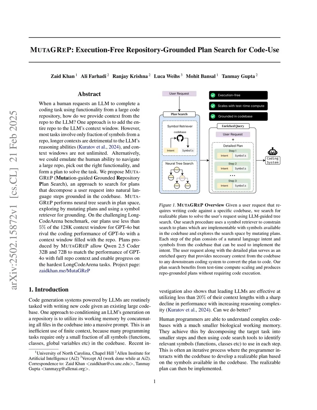 When a human requests an LLM to complete a coding task using functionality from a large code repository, how do we provide context from the repo to the LLM? One approach is to add the entire repo to the LLM's context window. However, most tasks involve only fraction of symbols from a repo, longer contexts are detrimental to the LLM's reasoning abilities, and context windows are not unlimited. Alternatively, we could emulate the human ability to navigate a large repo, pick out the right functionality, and form a plan to solve the task. We propose MutaGReP (Mutation-guided Grounded Repository Plan Search), an approach to search for plans that decompose a user request into natural language steps grounded in the codebase. MutaGReP performs neural tree search in plan space, exploring by mutating plans and using a symbol retriever for grounding. On the challenging LongCodeArena benchmark, our plans use less than 5% of the 128K context window for GPT-4o but rival the coding performance of GPT-4o with a context window filled with the repo. Plans produced by MutaGReP allow Qwen 2.5 Coder 32B and 72B to match the performance of GPT-4o with full repo context and enable progress on the hardest LongCodeArena tasks. Project page:this http URL