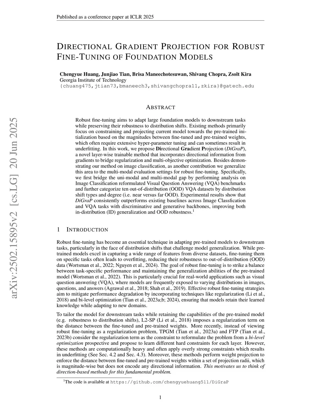 Robust fine-tuning aims to adapt large foundation models to downstream tasks while preserving their robustness to distribution shifts. Existing methods primarily focus on constraining and projecting current model towards the pre-trained initialization based on the magnitudes between fine-tuned and pre-trained weights, which often require extensive hyper-parameter tuning and can sometimes result in underfitting. In this work, we propose Directional Gradient Projection (DiGraP), a novel layer-wise trainable method that incorporates directional information from gradients to bridge regularization and multi-objective optimization. Besides demonstrating our method on image classification, as another contribution we generalize this area to the multi-modal evaluation settings for robust fine-tuning. Specifically, we first bridge the uni-modal and multi-modal gap by performing analysis on Image Classification reformulated Visual Question Answering (VQA) benchmarks and further categorize ten out-of-distribution (OOD) VQA datasets by distribution shift types and degree (i.e. near versus far OOD). Experimental results show that DiGraP consistently outperforms existing baselines across Image Classfication and VQA tasks with discriminative and generative backbones, improving both in-distribution (ID) generalization and OOD robustness.