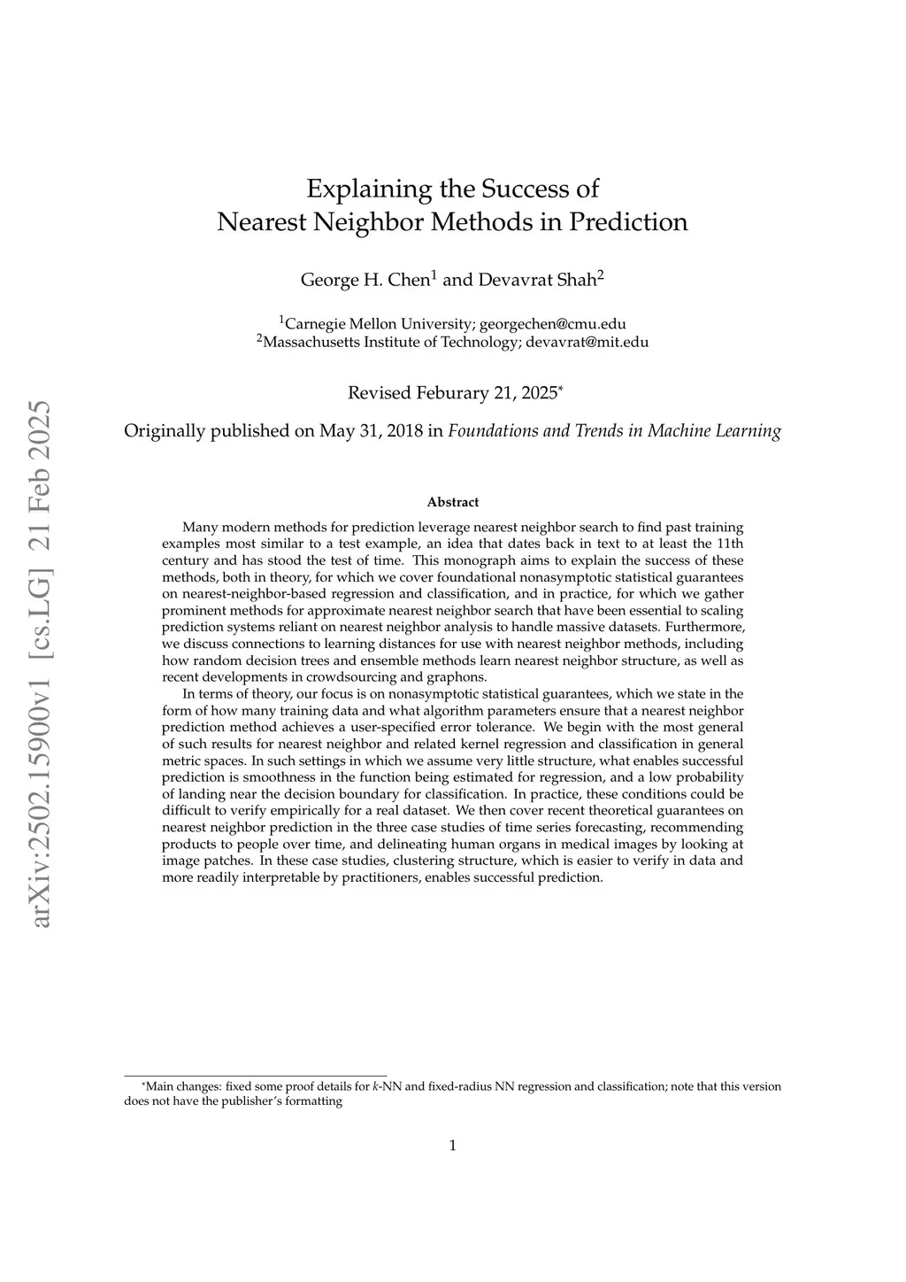 Many modern methods for prediction leverage nearest neighbor search to find past training examples most similar to a test example, an idea that dates back in text to at least the 11th century and has stood the test of time. This monograph aims to explain the success of these methods, both in theory, for which we cover foundational nonasymptotic statistical guarantees on nearest-neighbor-based regression and classification, and in practice, for which we gather prominent methods for approximate nearest neighbor search that have been essential to scaling prediction systems reliant on nearest neighbor analysis to handle massive datasets. Furthermore, we discuss connections to learning distances for use with nearest neighbor methods, including how random decision trees and ensemble methods learn nearest neighbor structure, as well as recent developments in crowdsourcing and graphons.In terms of theory, our focus is on nonasymptotic statistical guarantees, which we state in the form of how many training data and what algorithm parameters ensure that a nearest neighbor prediction method achieves a user-specified error tolerance. We begin with the most general of such results for nearest neighbor and related kernel regression and classification in general metric spaces. In such settings in which we assume very little structure, what enables successful prediction is smoothness in the function being estimated for regression, and a low probability of landing near the decision boundary for classification. In practice, these conditions could be difficult to verify for a real dataset. We then cover recent guarantees on nearest neighbor prediction in the three case studies of time series forecasting, recommending products to people over time, and delineating human organs in medical images by looking at image patches. In these case studies, clustering structure enables successful prediction.