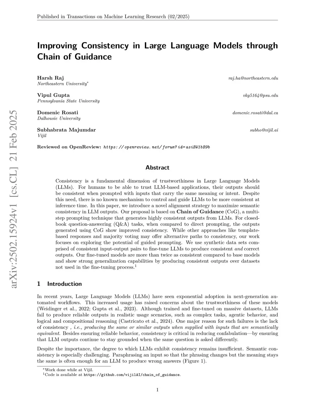Consistency is a fundamental dimension of trustworthiness in Large Language Models (LLMs). For humans to be able to trust LLM-based applications, their outputs should be consistent when prompted with inputs that carry the same meaning or intent. Despite this need, there is no known mechanism to control and guide LLMs to be more consistent at inference time. In this paper, we introduce a novel alignment strategy to maximize semantic consistency in LLM outputs. Our proposal is based on Chain of Guidance (CoG), a multistep prompting technique that generates highly consistent outputs from LLMs. For closed-book question-answering (Q&A) tasks, when compared to direct prompting, the outputs generated using CoG show improved consistency. While other approaches like template-based responses and majority voting may offer alternative paths to consistency, our work focuses on exploring the potential of guided prompting. We use synthetic data sets comprised of consistent input-output pairs to fine-tune LLMs to produce consistent and correct outputs. Our fine-tuned models are more than twice as consistent compared to base models and show strong generalization capabilities by producing consistent outputs over datasets not used in the fine-tuning process.