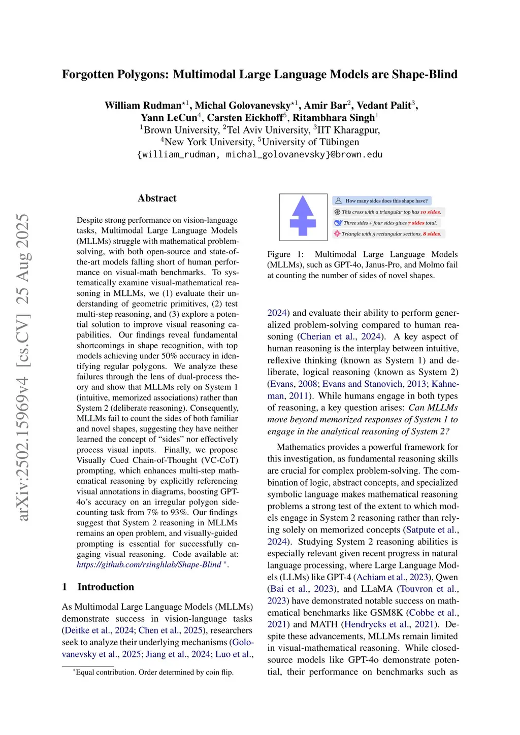 Despite strong performance on vision-language tasks, Multimodal Large Language Models (MLLMs) struggle with mathematical problem-solving, with both open-source and state-of-the-art models falling short of human performance on visual-math benchmarks. To systematically examine visual-mathematical reasoning in MLLMs, we (1) evaluate their understanding of geometric primitives, (2) test multi-step reasoning, and (3) explore a potential solution to improve visual reasoning capabilities. Our findings reveal fundamental shortcomings in shape recognition, with top models achieving under 50% accuracy in identifying regular polygons. We analyze these failures through the lens of dual-process theory and show that MLLMs rely on System 1 (intuitive, memorized associations) rather than System 2 (deliberate reasoning). Consequently, MLLMs fail to count the sides of both familiar and novel shapes, suggesting they have neither learned the concept of sides nor effectively process visual inputs. Finally, we propose Visually Cued Chain-of-Thought (VC-CoT) prompting, which enhances multi-step mathematical reasoning by explicitly referencing visual annotations in diagrams, boosting GPT-4o's accuracy on an irregular polygon side-counting task from 7% to 93%. Our findings suggest that System 2 reasoning in MLLMs remains an open problem, and visually-guided prompting is essential for successfully engaging visual reasoning. Code available at:this https URL.