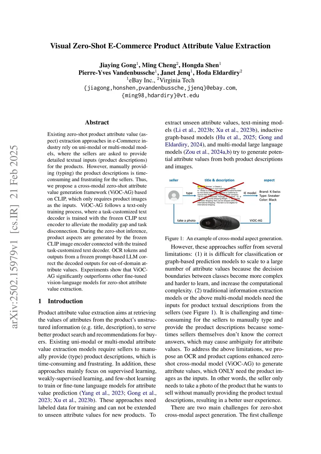 Existing zero-shot product attribute value (aspect) extraction approaches in e-Commerce industry rely on uni-modal or multi-modal models, where the sellers are asked to provide detailed textual inputs (product descriptions) for the products. However, manually providing (typing) the product descriptions is time-consuming and frustrating for the sellers. Thus, we propose a cross-modal zero-shot attribute value generation framework (ViOC-AG) based on CLIP, which only requires product images as the inputs. ViOC-AG follows a text-only training process, where a task-customized text decoder is trained with the frozen CLIP text encoder to alleviate the modality gap and task disconnection. During the zero-shot inference, product aspects are generated by the frozen CLIP image encoder connected with the trained task-customized text decoder. OCR tokens and outputs from a frozen prompt-based LLM correct the decoded outputs for out-of-domain attribute values. Experiments show that ViOC-AG significantly outperforms other fine-tuned vision-language models for zero-shot attribute value extraction.