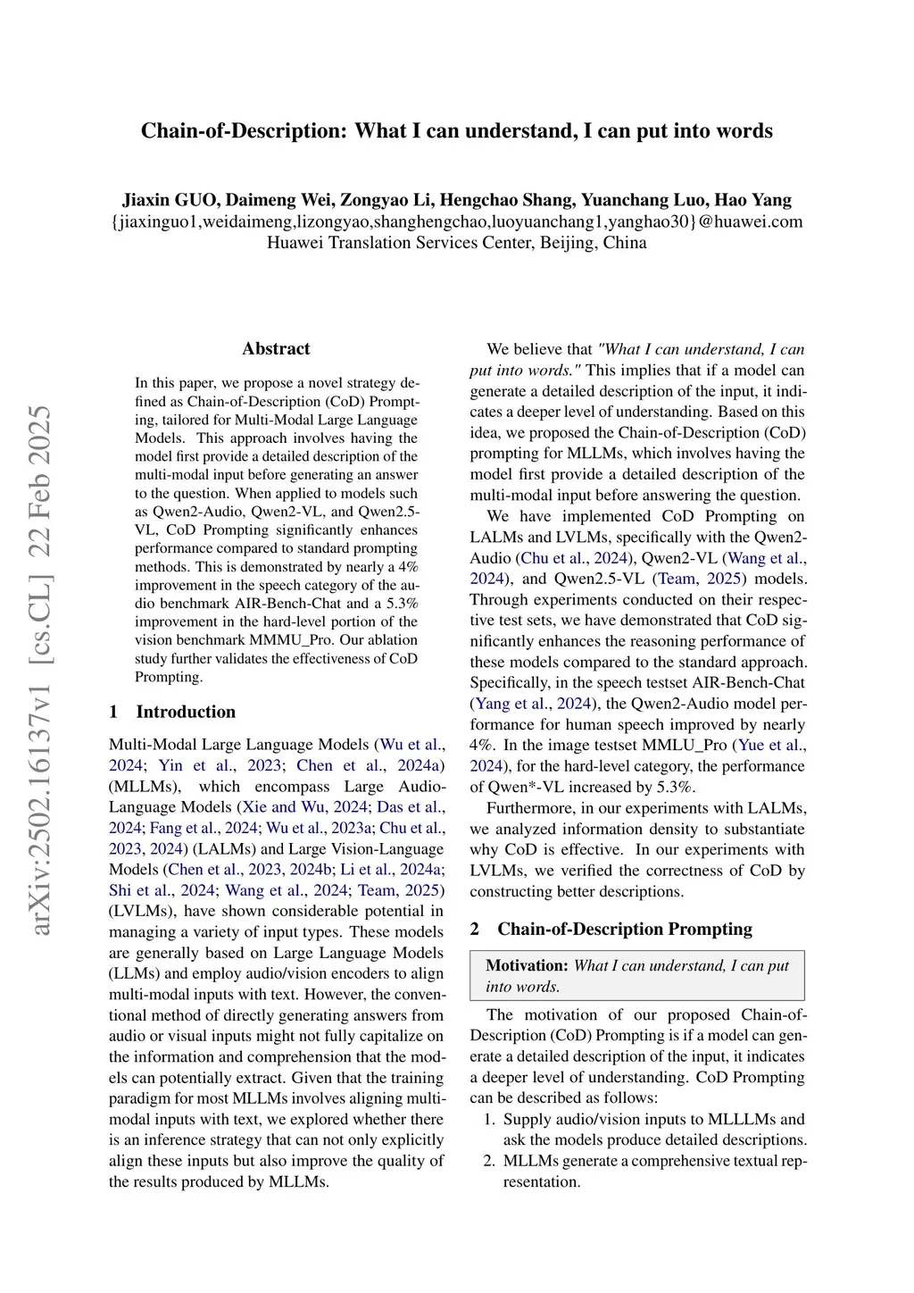 In this paper, we propose a novel strategy defined as Chain-of-Description (CoD) Prompting, tailored for Multi-Modal Large Language Models. This approach involves having the model first provide a detailed description of the multi-modal input before generating an answer to the question. When applied to models such as Qwen2-Audio, Qwen2-VL, and Qwen2.5-VL, CoD Prompting significantly enhances performance compared to standard prompting methods. This is demonstrated by nearly a 4\% improvement in the speech category of the audio benchmark AIR-Bench-Chat and a 5.3\% improvement in the hard-level portion of the vision benchmark MMMU\_Pro. Our ablation study further validates the effectiveness of CoD Prompting.