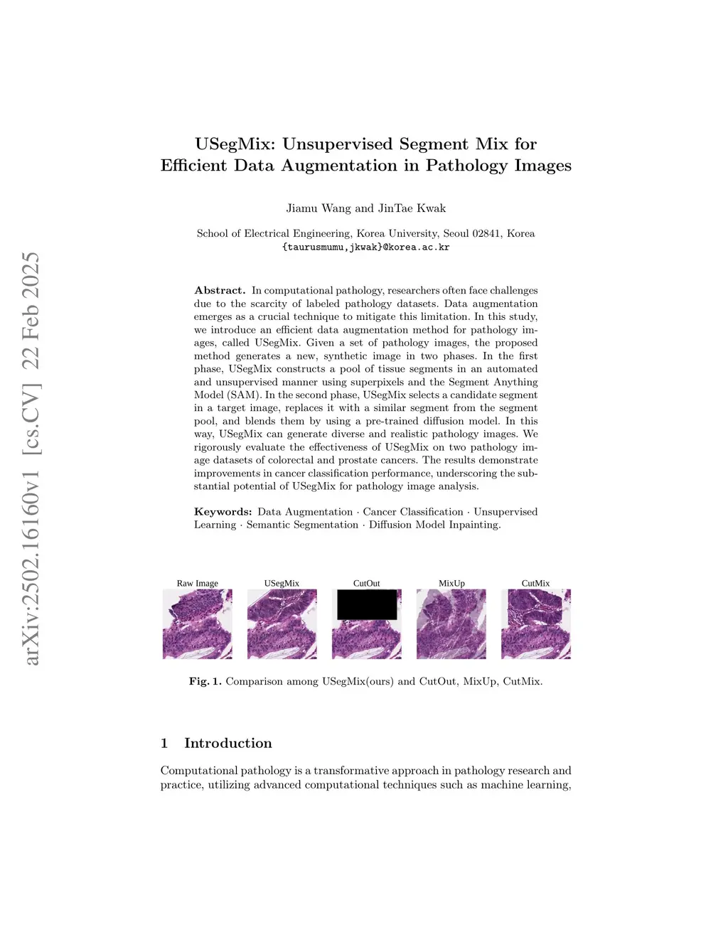 In computational pathology, researchers often face challenges due to the scarcity of labeled pathology datasets. Data augmentation emerges as a crucial technique to mitigate this limitation. In this study, we introduce an efficient data augmentation method for pathology images, called USegMix. Given a set of pathology images, the proposed method generates a new, synthetic image in two phases. In the first phase, USegMix constructs a pool of tissue segments in an automated and unsupervised manner using superpixels and the Segment Anything Model (SAM). In the second phase, USegMix selects a candidate segment in a target image, replaces it with a similar segment from the segment pool, and blends them by using a pre-trained diffusion model. In this way, USegMix can generate diverse and realistic pathology images. We rigorously evaluate the effectiveness of USegMix on two pathology image datasets of colorectal and prostate cancers. The results demonstrate improvements in cancer classification performance, underscoring the substantial potential of USegMix for pathology image analysis.