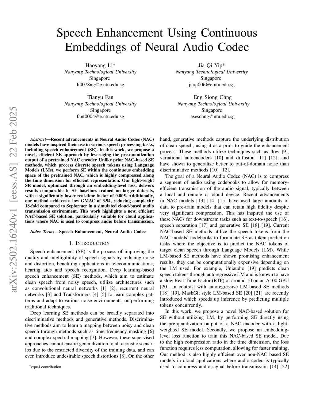 Recent advancements in Neural Audio Codec (NAC) models have inspired their use in various speech processing tasks, including speech enhancement (SE). In this work, we propose a novel, efficient SE approach by leveraging the pre-quantization output of a pretrained NAC encoder. Unlike prior NAC-based SE methods, which process discrete speech tokens using Language Models (LMs), we perform SE within the continuous embedding space of the pretrained NAC, which is highly compressed along the time dimension for efficient representation. Our lightweight SE model, optimized through an embedding-level loss, delivers results comparable to SE baselines trained on larger datasets, with a significantly lower real-time factor of 0.005. Additionally, our method achieves a low GMAC of 3.94, reducing complexity 18-fold compared to Sepformer in a simulated cloud-based audio transmission environment. This work highlights a new, efficient NAC-based SE solution, particularly suitable for cloud applications where NAC is used to compress audio before transmission.Copyright 20XX IEEE. Personal use of this material is permitted. Permission from IEEE must be obtained for all other uses, in any current or future media, including reprinting/republishing this material for advertising or promotional purposes, creating new collective works, for resale or redistribution to servers or lists, or reuse of any copyrighted component of this work in other works.