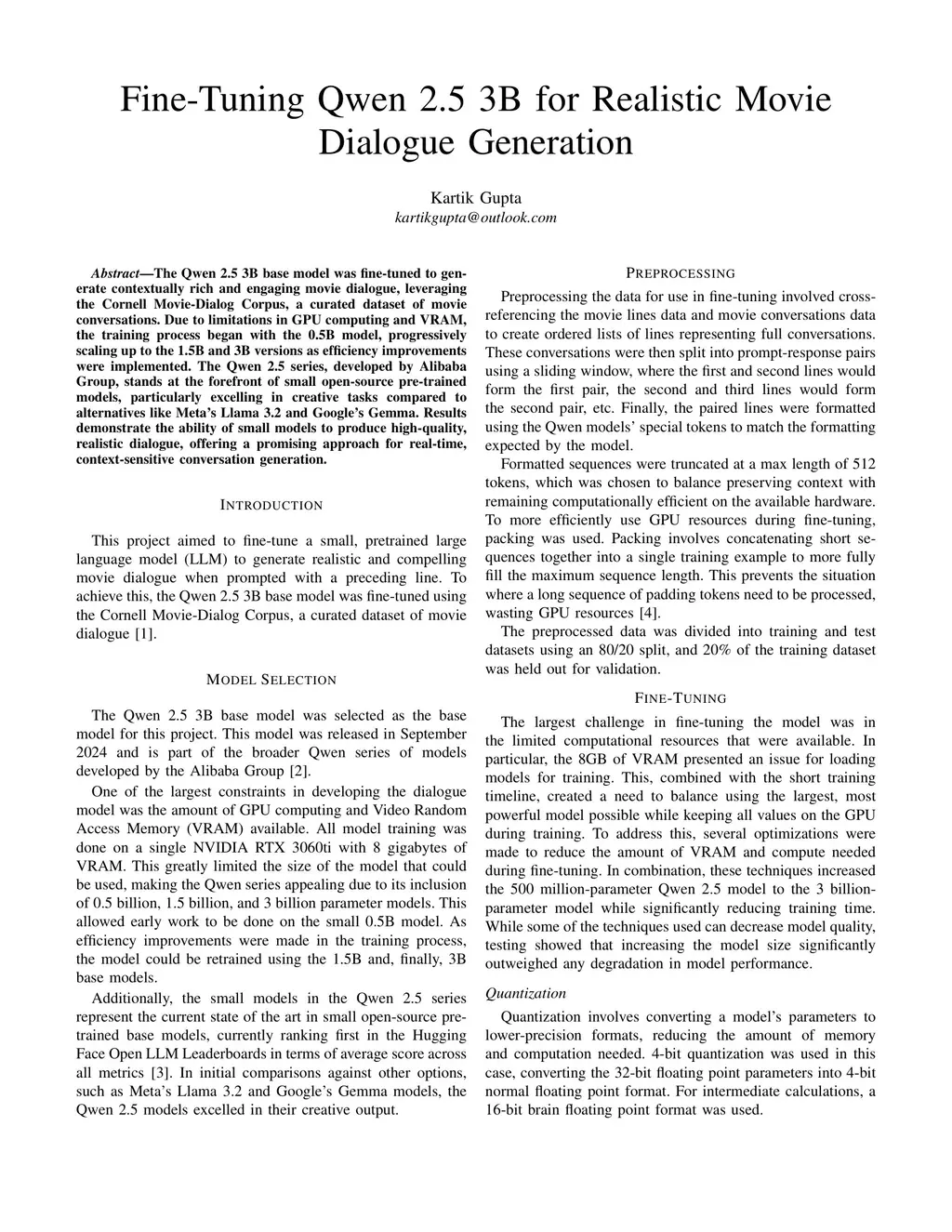 The Qwen 2.5 3B base model was fine-tuned to generate contextually rich and engaging movie dialogue, leveraging the Cornell Movie-Dialog Corpus, a curated dataset of movie conversations. Due to the limitations in GPU computing and VRAM, the training process began with the 0.5B model progressively scaling up to the 1.5B and 3B versions as efficiency improvements were implemented. The Qwen 2.5 series, developed by Alibaba Group, stands at the forefront of small open-source pre-trained models, particularly excelling in creative tasks compared to alternatives like Meta's Llama 3.2 and Google's Gemma. Results demonstrate the ability of small models to produce high-quality, realistic dialogue, offering a promising approach for real-time, context-sensitive conversation generation.