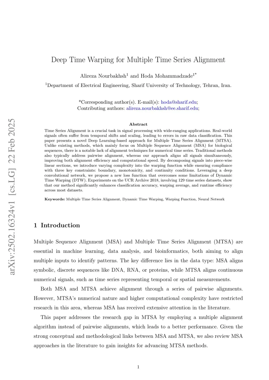 Time Series Alignment is a critical task in signal processing with numerous real-world applications. In practice, signals often exhibit temporal shifts and scaling, making classification on raw data prone to errors. This paper introduces a novel approach for Multiple Time Series Alignment (MTSA) leveraging Deep Learning techniques. While most existing methods primarily address Multiple Sequence Alignment (MSA) for protein and DNA sequences, there remains a significant gap in alignment methodologies for numerical time series. Additionally, conventional approaches typically focus on pairwise alignment, whereas our proposed method aligns all signals in a multiple manner (all the signals are aligned together at once). This innovation not only enhances alignment efficiency but also significantly improves computational speed. By decomposing into piece-wise linear sections, we introduce varying levels of complexity into the warping function. Additionally, our method ensures the satisfaction of three warping constraints: boundary, monotonicity, and continuity conditions. The utilization of a deep convolutional network allows us to employ a new loss function, addressing some limitations of Dynamic Time Warping (DTW). Experimental results on the UCR Archive 2018, comprising 129 time series datasets, demonstrate that employing our approach to align signals significantly enhances classification accuracy and warping average and also reduces the run time across the majority of these datasets.