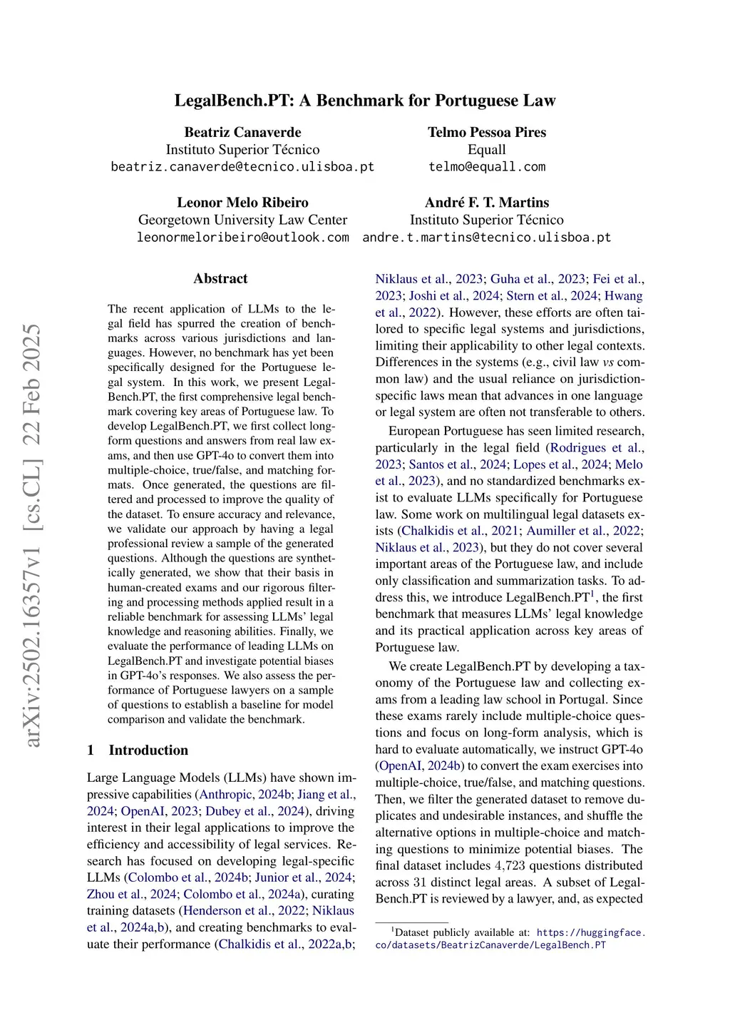 The recent application of LLMs to the legal field has spurred the creation of benchmarks across various jurisdictions and languages. However, no benchmark has yet been specifically designed for the Portuguese legal system. In this work, we presentthis http URL, the first comprehensive legal benchmark covering key areas of Portuguese law. To developthis http URL, we first collect long-form questions and answers from real law exams, and then use GPT-4o to convert them into multiple-choice, true/false, and matching formats. Once generated, the questions are filtered and processed to improve the quality of the dataset. To ensure accuracy and relevance, we validate our approach by having a legal professional review a sample of the generated questions. Although the questions are synthetically generated, we show that their basis in human-created exams and our rigorous filtering and processing methods applied result in a reliable benchmark for assessing LLMs' legal knowledge and reasoning abilities. Finally, we evaluate the performance of leading LLMs onthis http URLand investigate potential biases in GPT-4o's responses. We also assess the performance of Portuguese lawyers on a sample of questions to establish a baseline for model comparison and validate the benchmark.