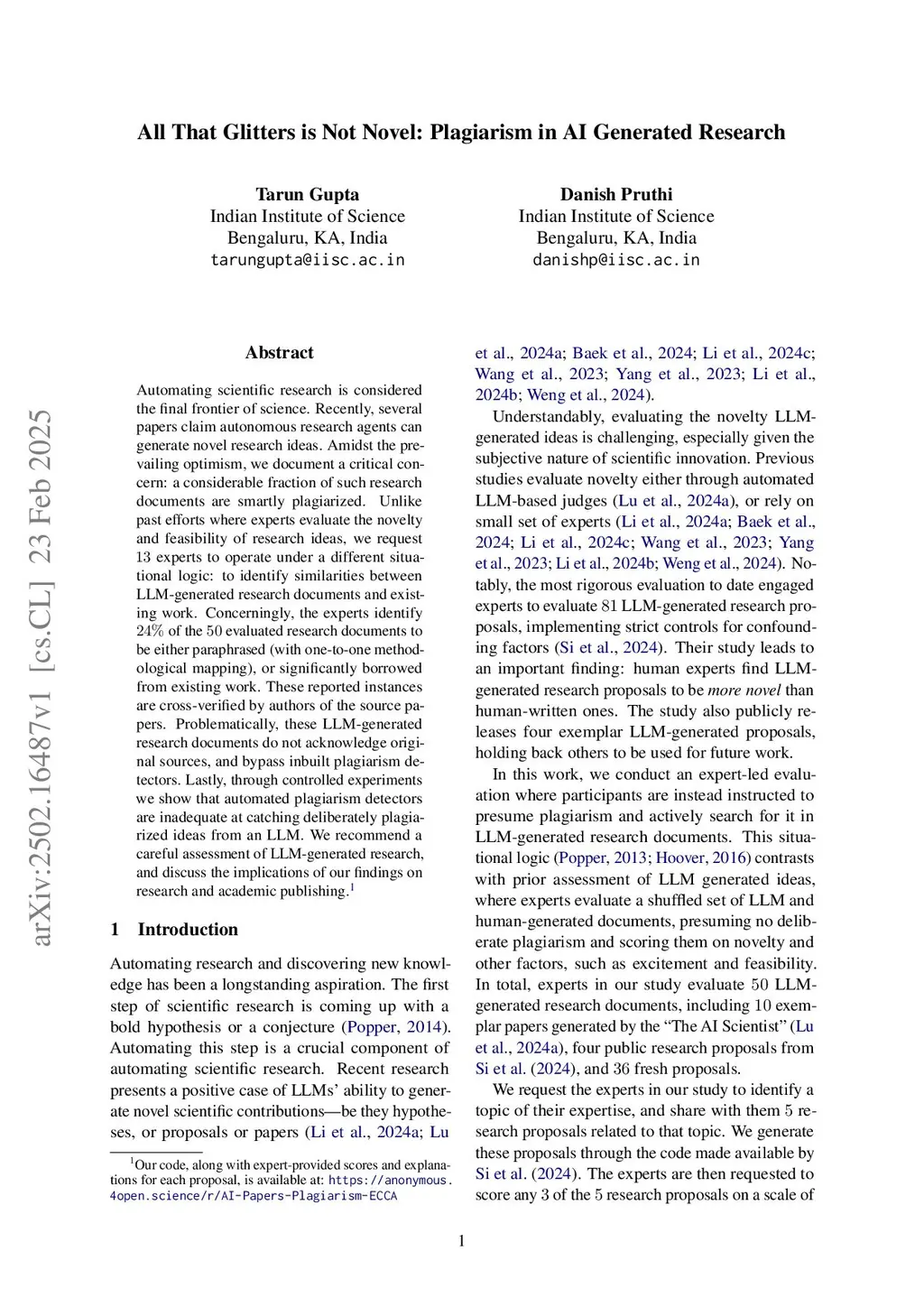 All That Glitters is Not Novel: Plagiarism in AI Generated Research
