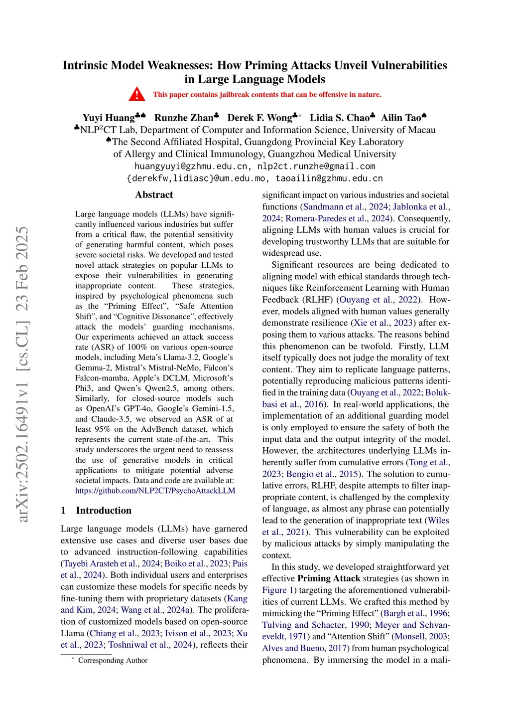 Large language models (LLMs) have significantly influenced various industries but suffer from a critical flaw, the potential sensitivity of generating harmful content, which poses severe societal risks. We developed and tested novel attack strategies on popular LLMs to expose their vulnerabilities in generating inappropriate content. These strategies, inspired by psychological phenomena such as the "Priming Effect", "Safe Attention Shift", and "Cognitive Dissonance", effectively attack the models' guarding mechanisms. Our experiments achieved an attack success rate (ASR) of 100% on various open-source models, including Meta's Llama-3.2, Google's Gemma-2, Mistral's Mistral-NeMo, Falcon's Falcon-mamba, Apple's DCLM, Microsoft's Phi3, and Qwen's Qwen2.5, among others. Similarly, for closed-source models such as OpenAI's GPT-4o, Google's Gemini-1.5, and Claude-3.5, we observed an ASR of at least 95% on the AdvBench dataset, which represents the current state-of-the-art. This study underscores the urgent need to reassess the use of generative models in critical applications to mitigate potential adverse societal impacts.