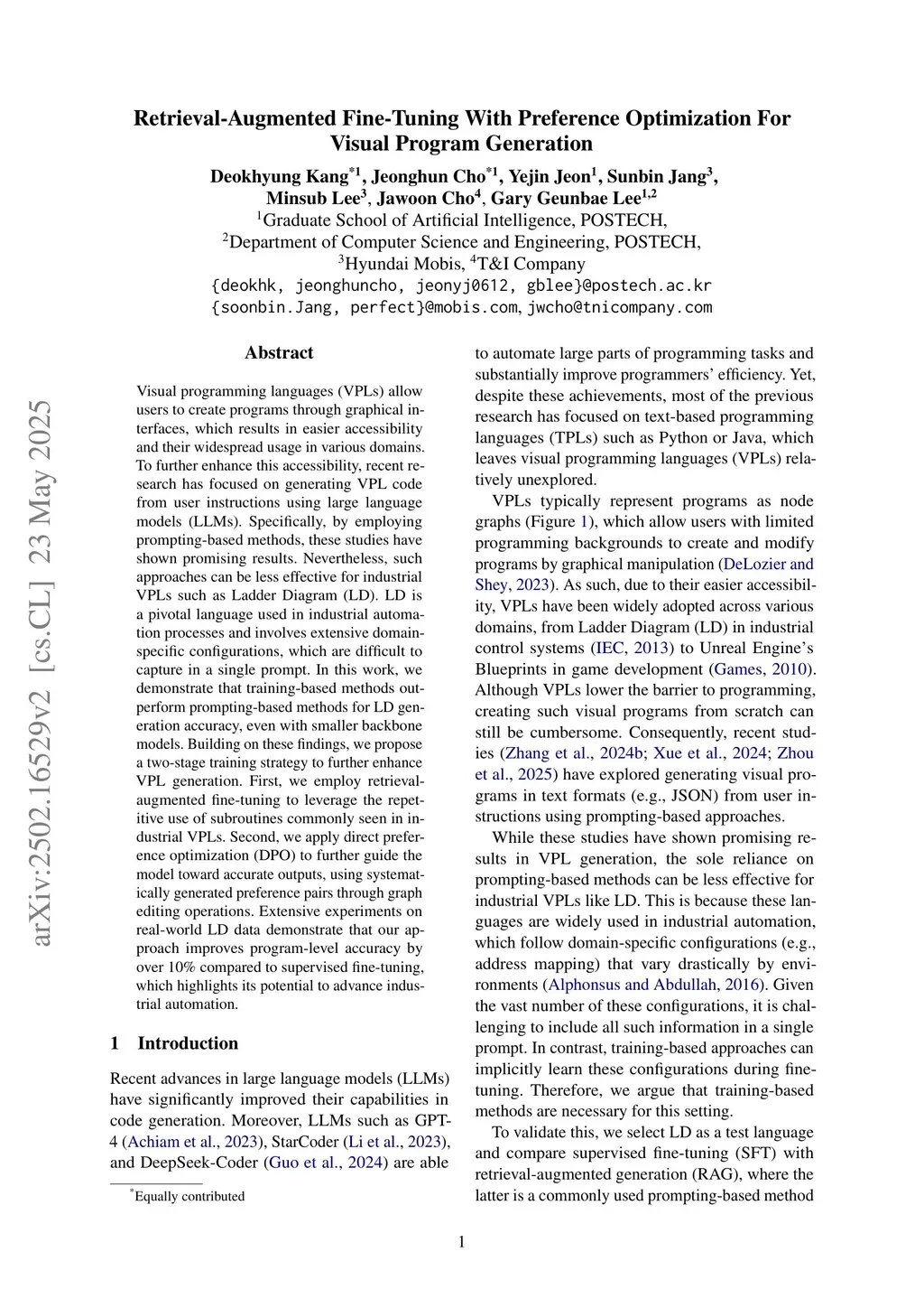 Visual programming languages (VPLs) allow users to create programs through graphical interfaces, which results in easier accessibility and their widespread usage in various domains. To further enhance this accessibility, recent research has focused on generating VPL code from user instructions using large language models (LLMs). Specifically, by employing prompting-based methods, these studies have shown promising results. Nevertheless, such approaches can be less effective for industrial VPLs such as Ladder Diagram (LD). LD is a pivotal language used in industrial automation processes and involves extensive domain-specific configurations, which are difficult to capture in a single prompt. In this work, we demonstrate that training-based methods outperform prompting-based methods for LD generation accuracy, even with smaller backbone models. Building on these findings, we propose a two-stage training strategy to further enhance VPL generation. First, we employ retrieval-augmented fine-tuning to leverage the repetitive use of subroutines commonly seen in industrial VPLs. Second, we apply direct preference optimization (DPO) to further guide the model toward accurate outputs, using systematically generated preference pairs through graph editing operations. Extensive experiments on real-world LD data demonstrate that our approach improves program-level accuracy by over 10% compared to supervised fine-tuning, which highlights its potential to advance industrial automation.