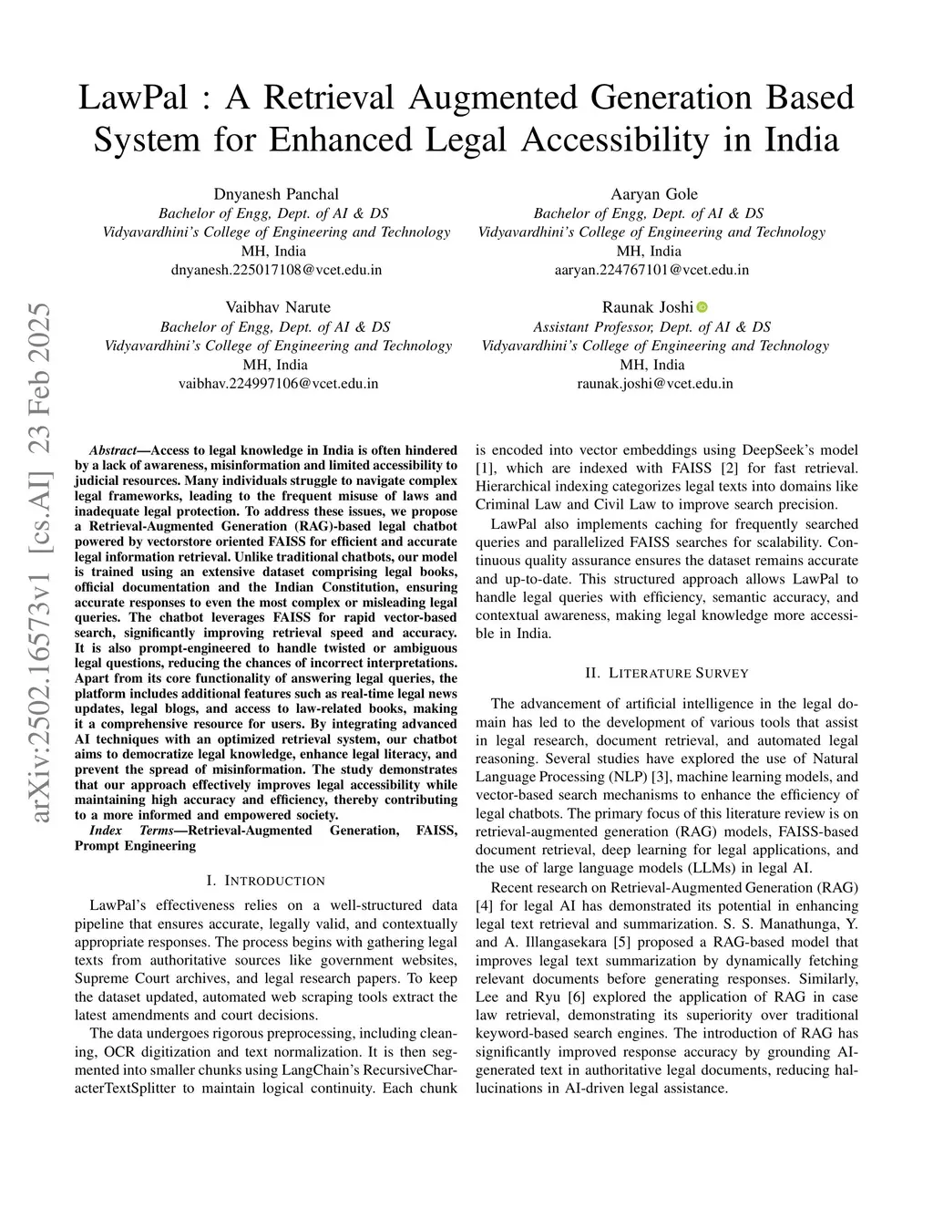 Access to legal knowledge in India is often hindered by a lack of awareness, misinformation and limited accessibility to judicial resources. Many individuals struggle to navigate complex legal frameworks, leading to the frequent misuse of laws and inadequate legal protection. To address these issues, we propose a Retrieval-Augmented Generation (RAG)-based legal chatbot powered by vectorstore oriented FAISS for efficient and accurate legal information retrieval. Unlike traditional chatbots, our model is trained using an extensive dataset comprising legal books, official documentation and the Indian Constitution, ensuring accurate responses to even the most complex or misleading legal queries. The chatbot leverages FAISS for rapid vector-based search, significantly improving retrieval speed and accuracy. It is also prompt-engineered to handle twisted or ambiguous legal questions, reducing the chances of incorrect interpretations. Apart from its core functionality of answering legal queries, the platform includes additional features such as real-time legal news updates, legal blogs, and access to law-related books, making it a comprehensive resource for users. By integrating advanced AI techniques with an optimized retrieval system, our chatbot aims to democratize legal knowledge, enhance legal literacy, and prevent the spread of misinformation. The study demonstrates that our approach effectively improves legal accessibility while maintaining high accuracy and efficiency, thereby contributing to a more informed and empowered society.