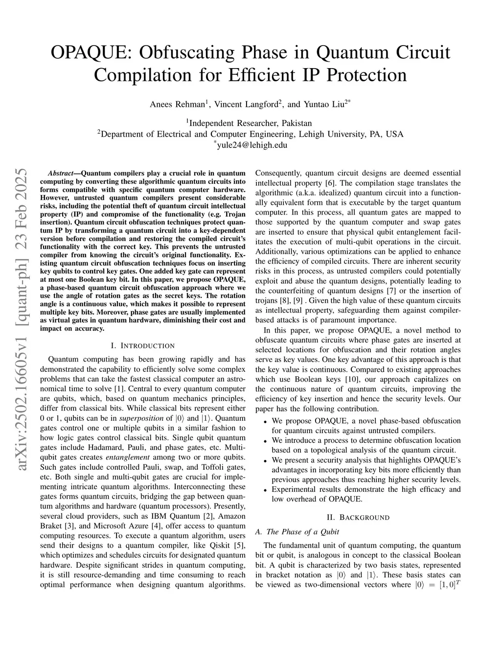 Quantum compilers play a crucial role in quantum computing by converting these algorithmic quantum circuits into forms compatible with specific quantum computer hardware. However, untrusted quantum compilers present considerable risks, including the potential theft of quantum circuit intellectual property (IP) and compromise of the functionality (e.g. Trojan insertion). Quantum circuit obfuscation techniques protect quantum IP by transforming a quantum circuit into a key-dependent version before compilation and restoring the compiled circuit's functionality with the correct key. This prevents the untrusted compiler from knowing the circuit's original functionality. Existing quantum circuit obfuscation techniques focus on inserting key qubits to control key gates. One added key gate can represent at most one Boolean key bit. In this paper, we propose OPAQUE, a phase-based quantum circuit obfuscation approach where we use the angle of rotation gates as the secret keys. The rotation angle is a continuous value, which makes it possible to represent multiple key bits. Moreover, phase gates are usually implemented as virtual gates in quantum hardware, diminishing their cost and impact on accuracy.