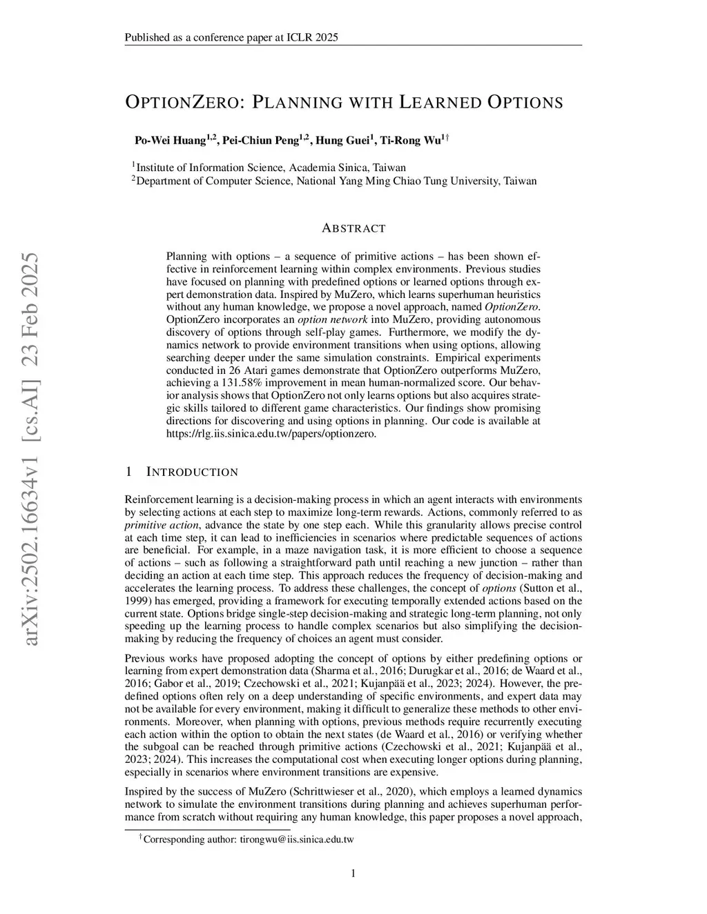 Planning with options -- a sequence of primitive actions -- has been shown effective in reinforcement learning within complex environments. Previous studies have focused on planning with predefined options or learned options through expert demonstration data. Inspired by MuZero, which learns superhuman heuristics without any human knowledge, we propose a novel approach, named OptionZero. OptionZero incorporates an option network into MuZero, providing autonomous discovery of options through self-play games. Furthermore, we modify the dynamics network to provide environment transitions when using options, allowing searching deeper under the same simulation constraints. Empirical experiments conducted in 26 Atari games demonstrate that OptionZero outperforms MuZero, achieving a 131.58% improvement in mean human-normalized score. Our behavior analysis shows that OptionZero not only learns options but also acquires strategic skills tailored to different game characteristics. Our findings show promising directions for discovering and using options in planning. Our code is available atthis https URL.