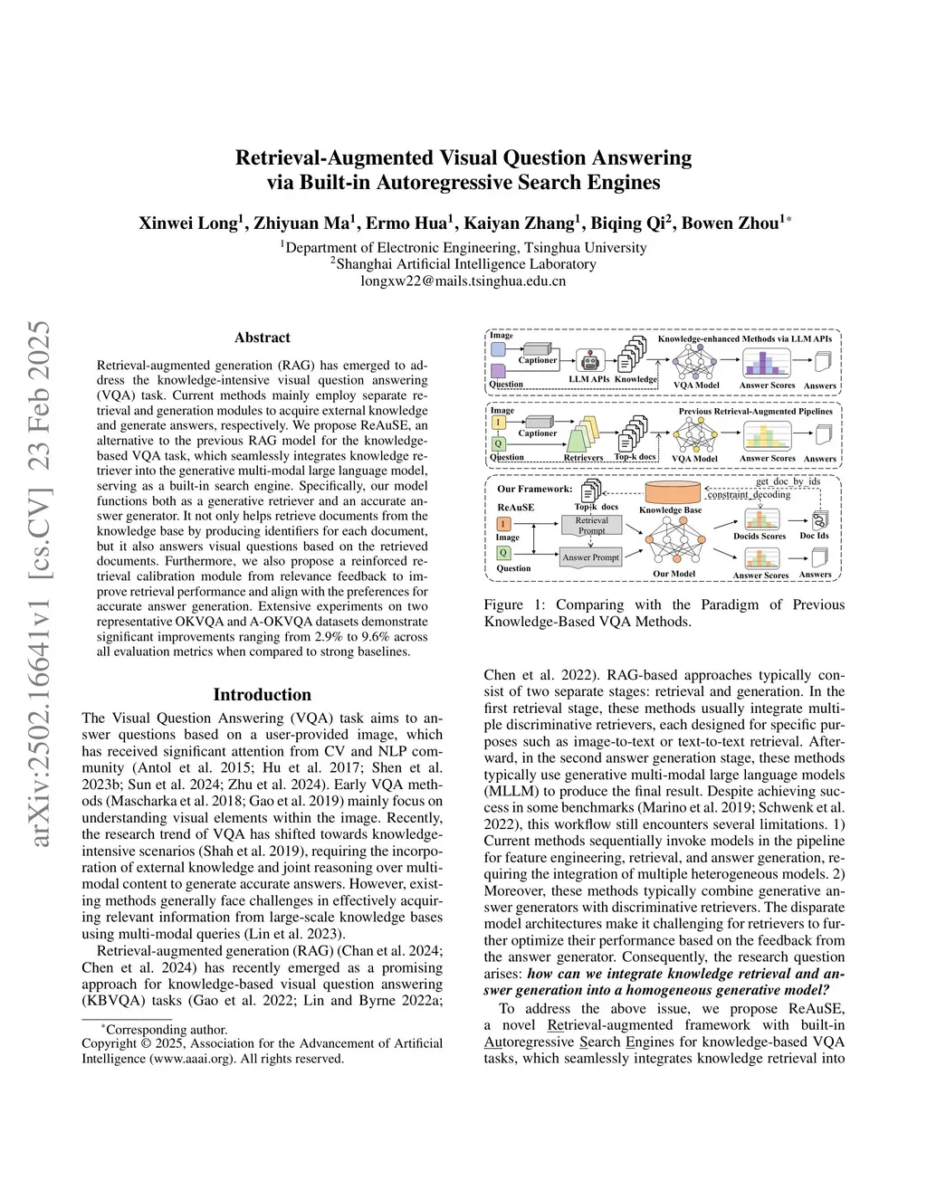 Retrieval-augmented generation (RAG) has emerged to address the knowledge-intensive visual question answering (VQA) task. Current methods mainly employ separate retrieval and generation modules to acquire external knowledge and generate answers, respectively. We propose ReAuSE, an alternative to the previous RAG model for the knowledge-based VQA task, which seamlessly integrates knowledge retriever into the generative multi-modal large language model, serving as a built-in search engine. Specifically, our model functions both as a generative retriever and an accurate answer generator. It not only helps retrieve documents from the knowledge base by producing identifiers for each document, but it also answers visual questions based on the retrieved documents. Furthermore, we propose a reinforced retrieval calibration module from relevance feedback to improve retrieval performance and align with the preferences for accurate answer generation. Extensive experiments on two representative OKVQA and A-OKVQA datasets demonstrate significant improvements ranging from 2.9\% to 9.6\% across all evaluation metrics when compared to strong baselines.